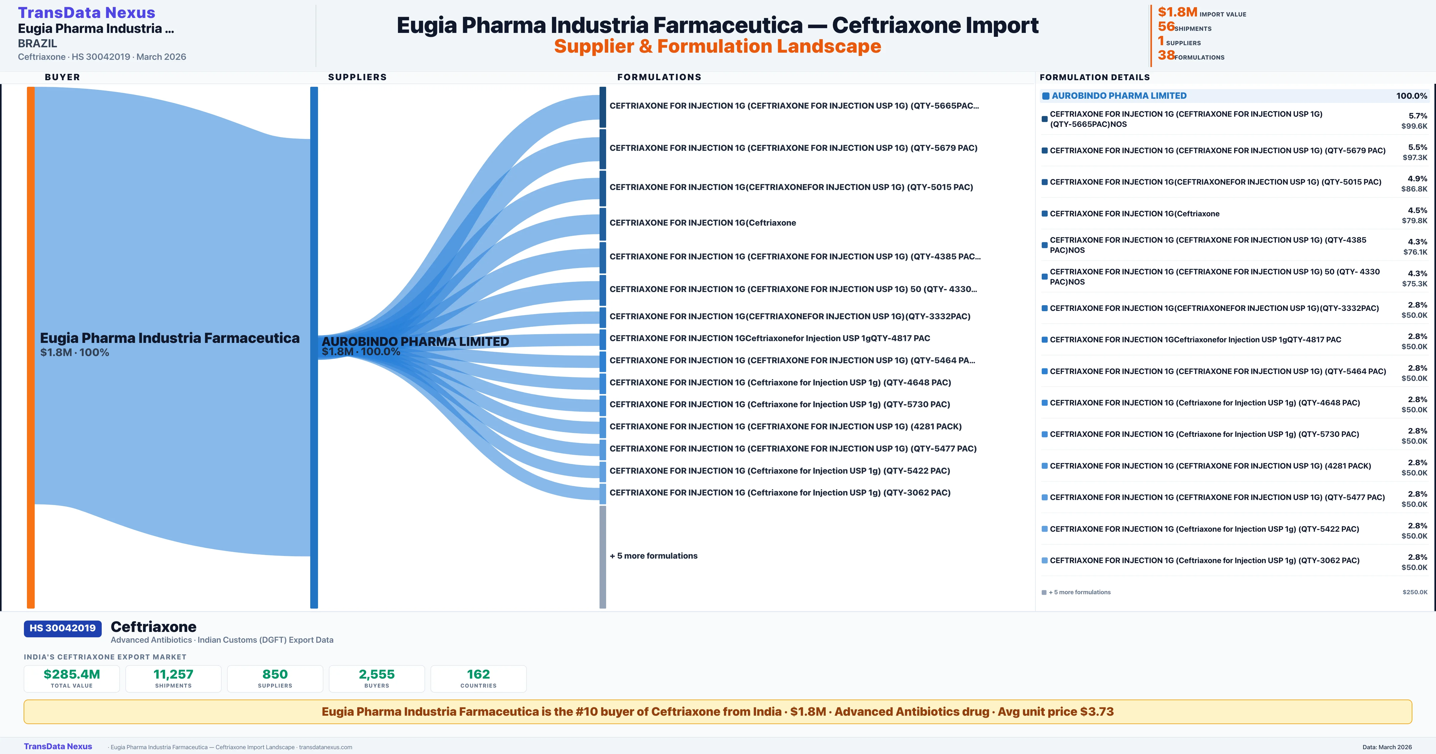 - 5.Verified Records: This page is backed by 56 individual customs records matching EUGIA PHARMA INDUSTRIA FARMACEUTICA importing Ceftriaxone, covering 38 formulations from 1 verified supplier.