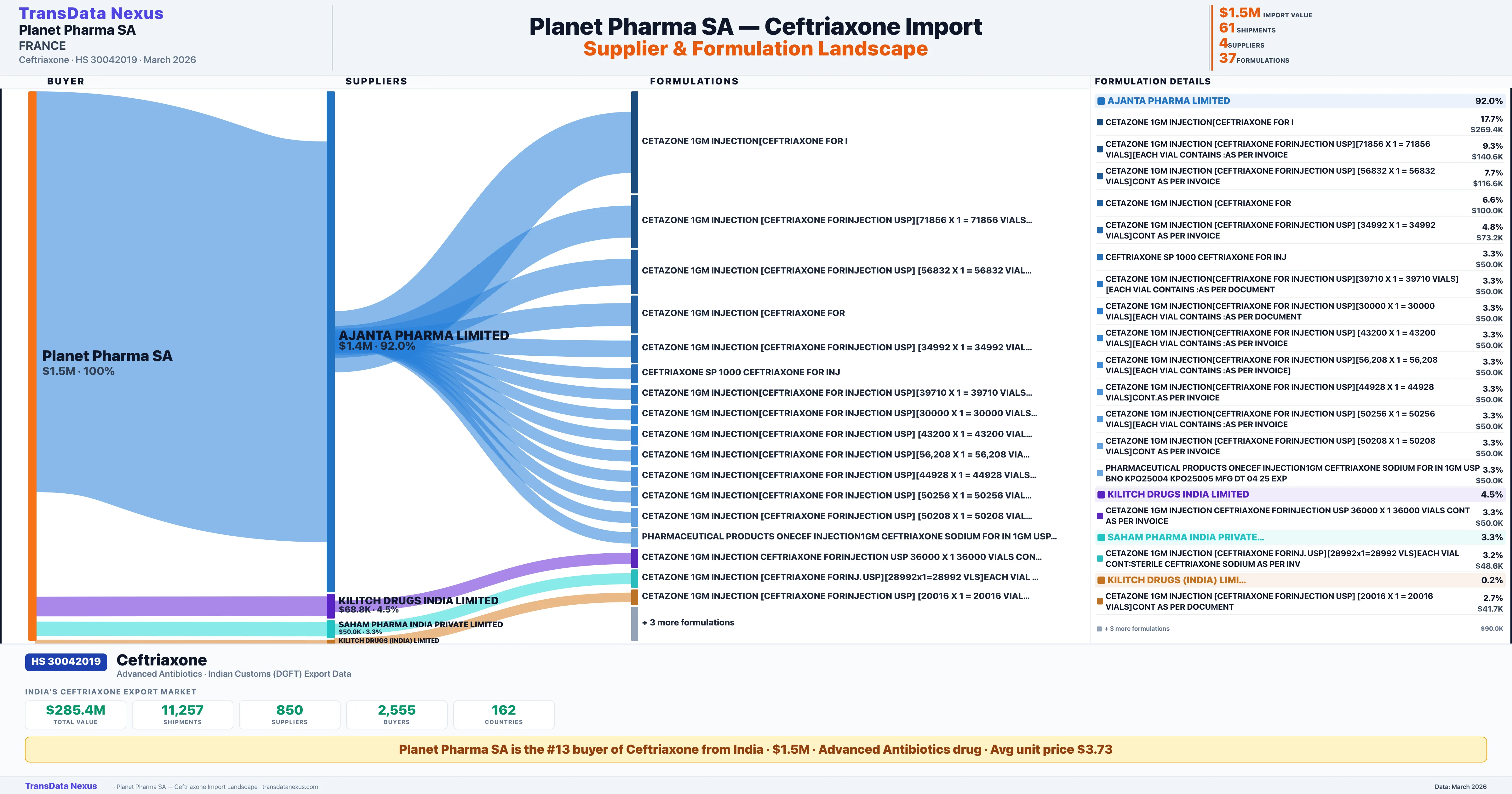 PLANET PHARMA SA sources Ceftriaxone from 4 verified Indian suppliers: AJANTA PHARMA LIMITED ($1.4M, 92.0%), KILITCH DRUGS INDIA LIMITED ($68.8K, 4.5%), SAHAM PHARMA INDIA PRIVATE LIMITED ($50.0K, 3.3%), KILITCH DRUGS (INDIA) LIMITED ($3.4K, 0.2%). This is based on 61 customs records.