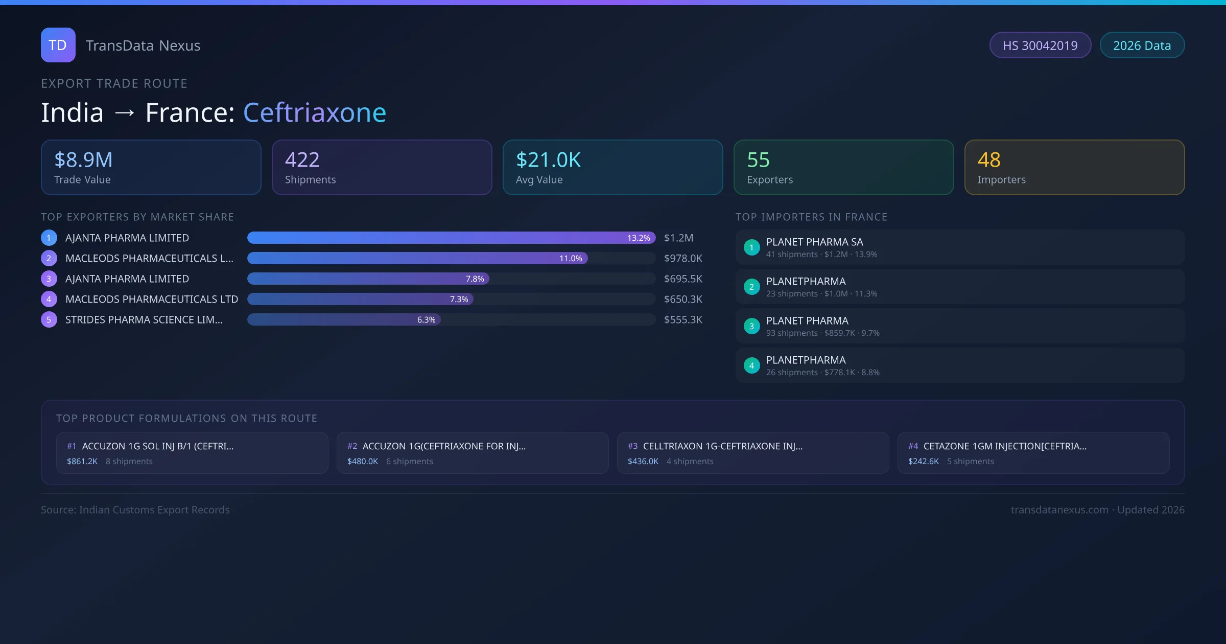 The India to France Ceftriaxone corridor is one of India's established pharmaceutical export routes, with 422 shipments documented worth a combined $8.9M USD. The route is dominated by AJANTA PHARMA LIMITED, which alone accounts for roughly 13% of all export value, reflecting the consolidated nature of India's ceftriaxone manufacturing sector.