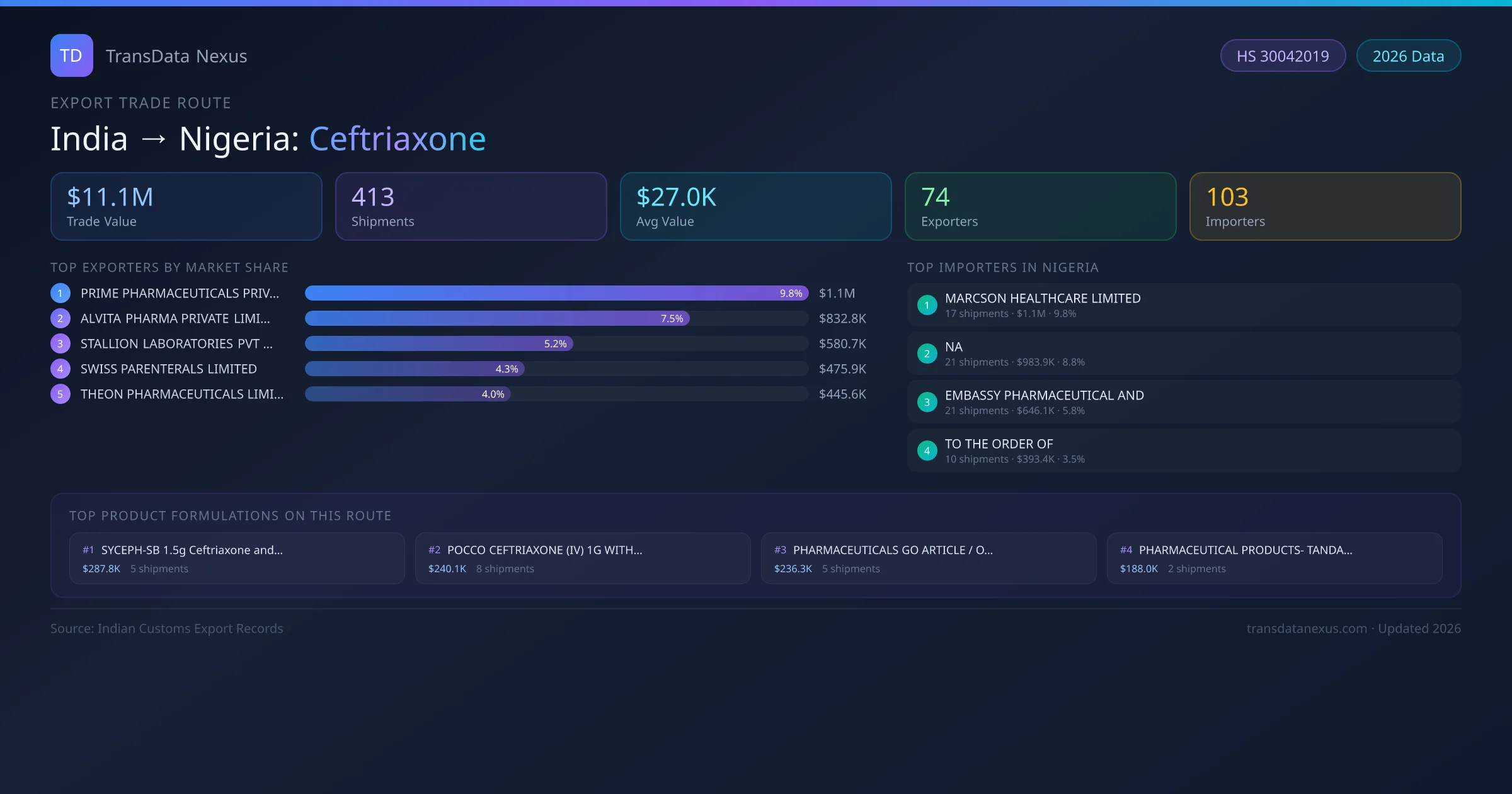 India exports Ceftriaxone to Nigeria worth approximately $11.1M USD across 413 recorded shipments. The average value per shipment is $27.0K USD.