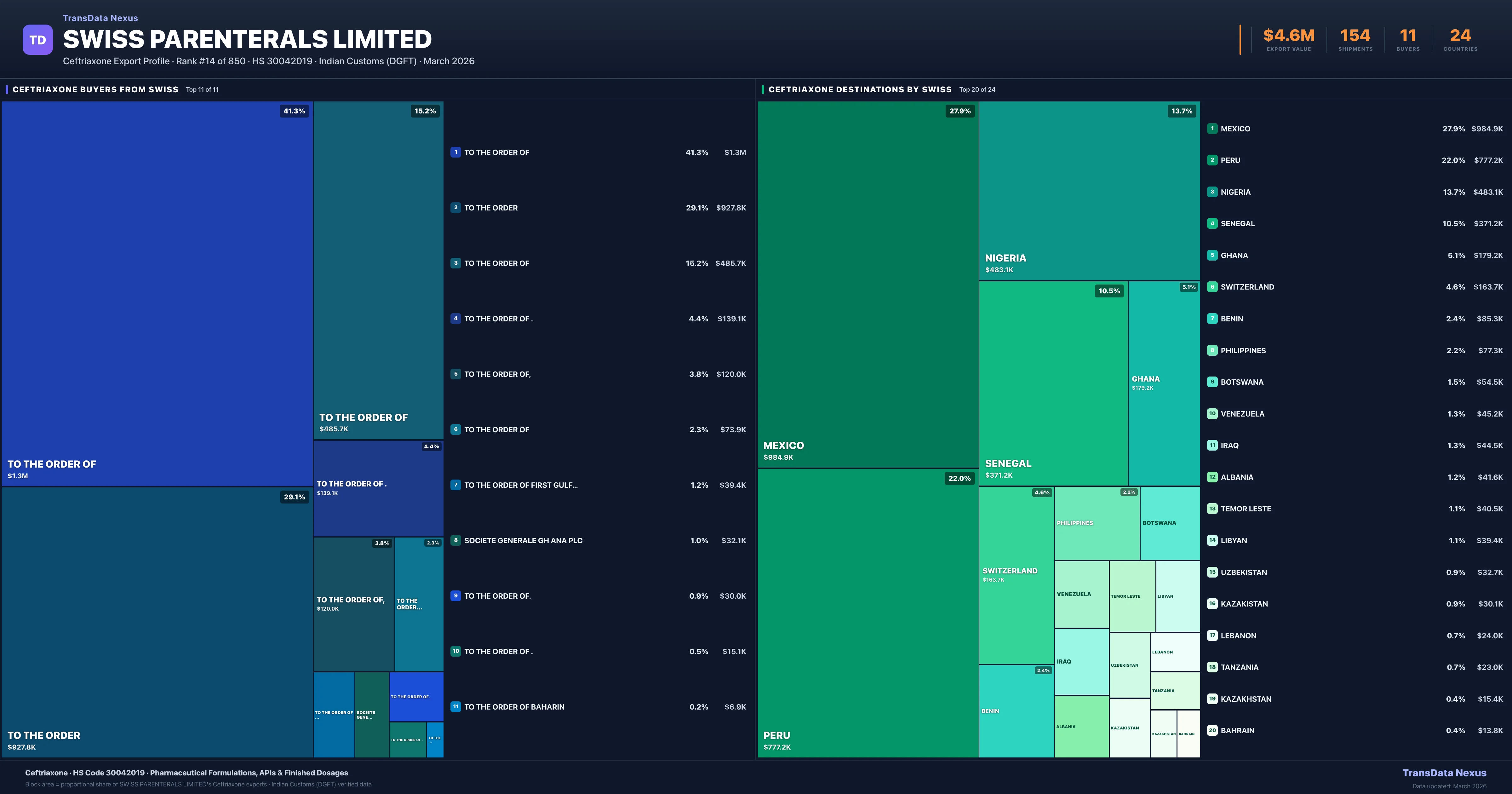 Swiss Parenterals Limited's average Ceftriaxone shipment value is $29.6K per consignment, based on 154 shipments totaling $4.6M. The largest destination is MEXICO (27.8% of Swiss Parenterals Limited's Ceftriaxone exports).
