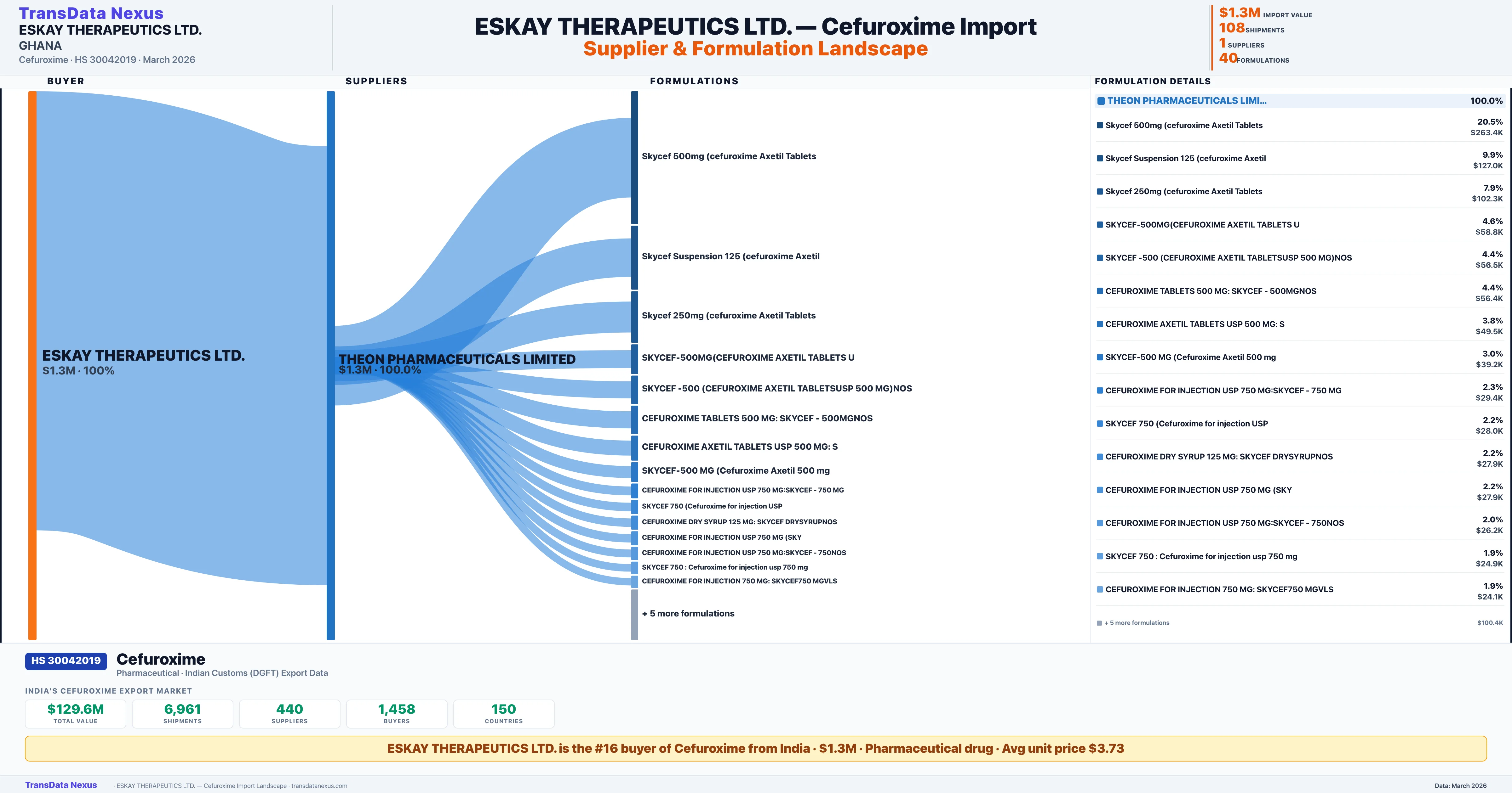 ESKAY THERAPEUTICS LTD. sources Cefuroxime from 1 verified Indian supplier: THEON PHARMACEUTICALS LIMITED ($1.3M, 100.0%). This is based on 108 customs records.