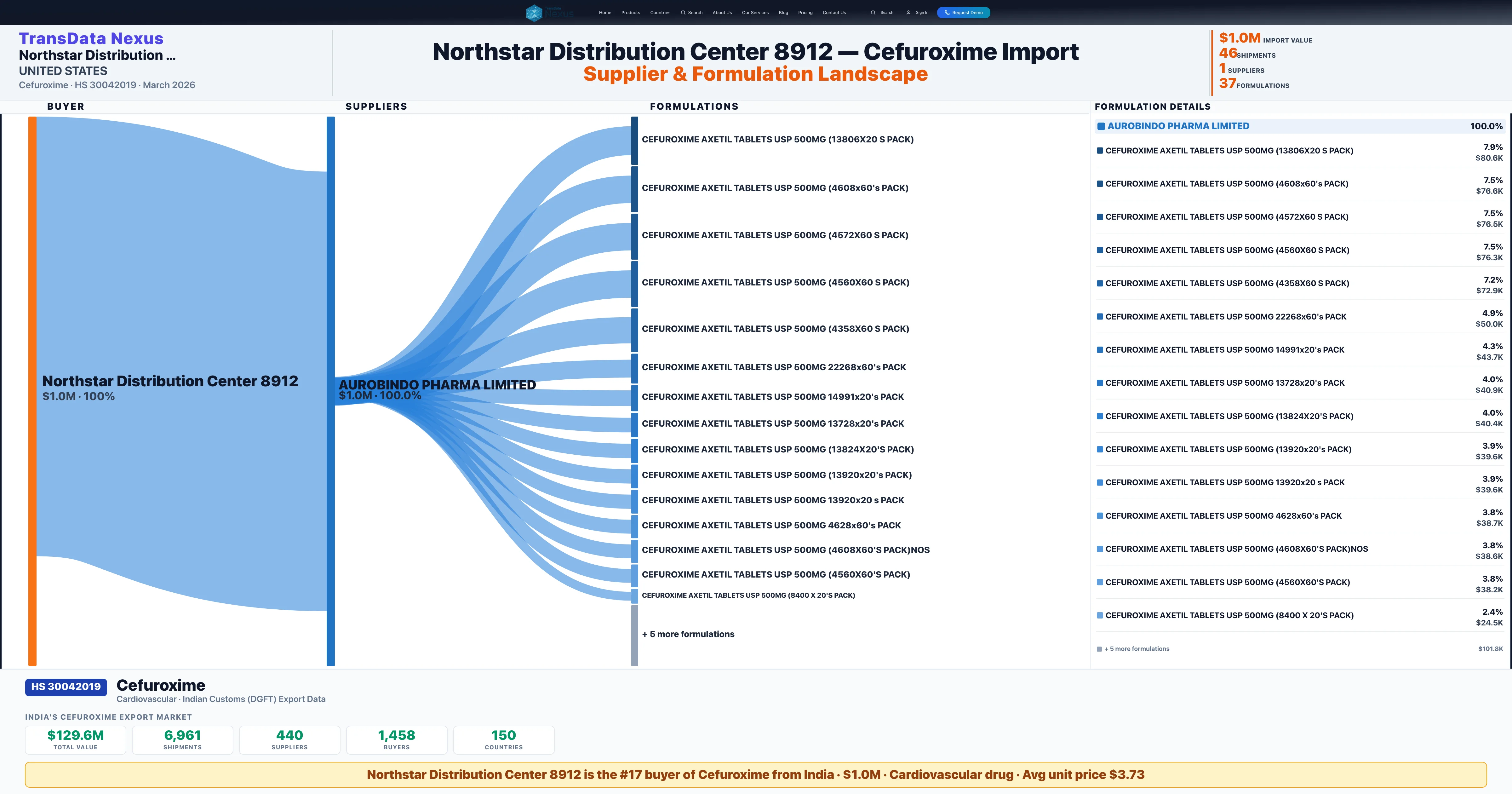 Access order-level details, pricing data, supplier connections, and competitive analysis for NORTHSTAR DISTRIBUTION CENTER 8912's Cefuroxime imports. TransData Nexus provides verified Indian Customs (DGFT) data trusted by pharmaceutical trade professionals worldwide.