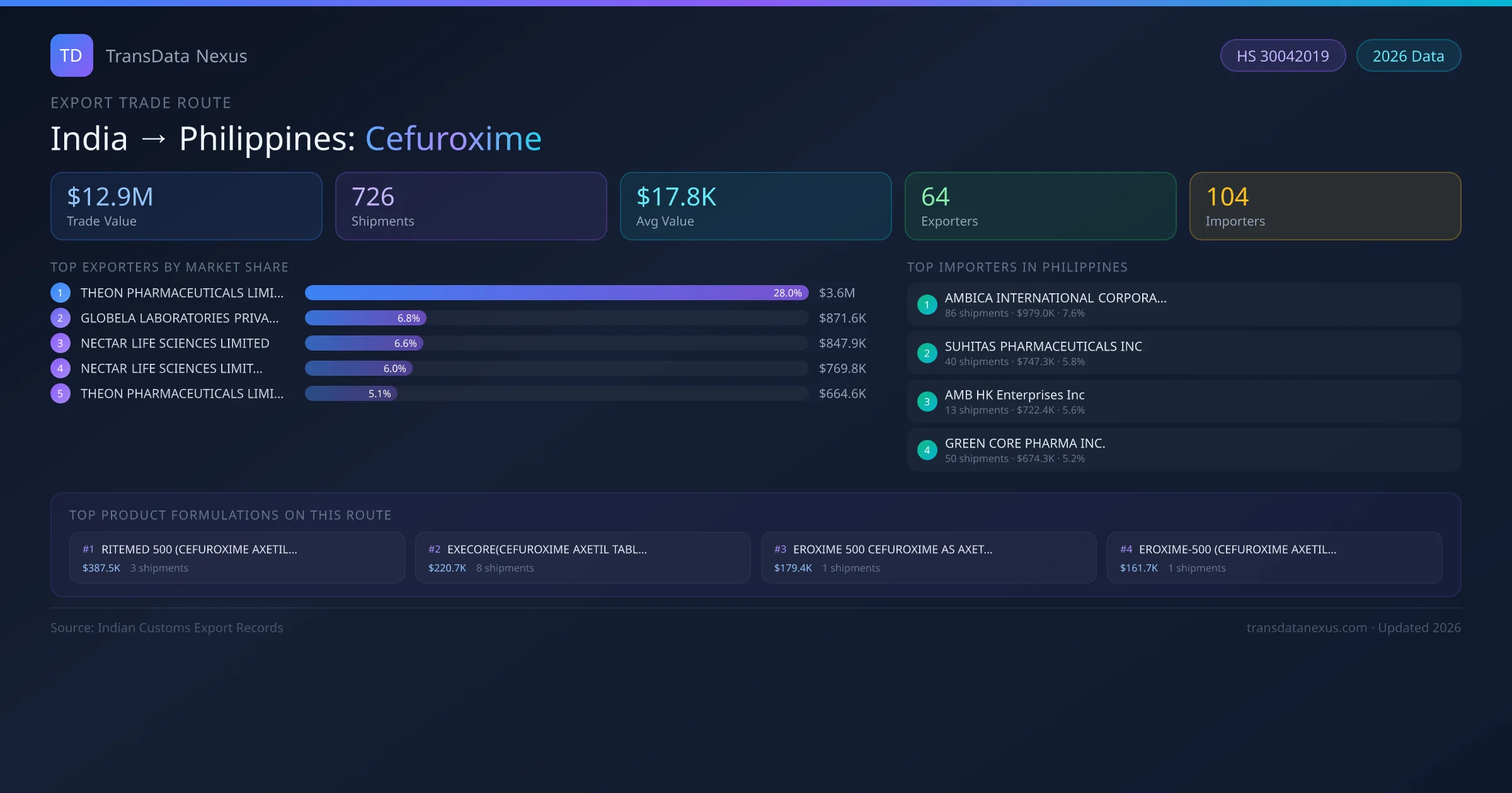 India has recorded 726 verified shipments of Cefuroxime exported to Philippines, representing a combined trade value of $12.9M USD. This corridor is served by 64 active Indian exporters, with an average shipment value of $17.8K USD. The leading Indian exporter is THEON PHARMACEUTICALS LIMITED, which accounts for 28% of total export value with 269 shipments worth $3.6M USD. On the buying side, AMBICA INTERNATIONAL CORPORATION is the largest importer in Philippines with $979.0K USD in purchases. The top 3 suppliers — THEON PHARMACEUTICALS LIMITED, GLOBELA LABORATORIES PRIVATE LIMITED, NECTAR LIFE SCIENCES LIMITED — together control 41% of total trade value on this route. All data sourced from Indian Customs (DGFT) shipping bill records. Values reported in FOB USD.