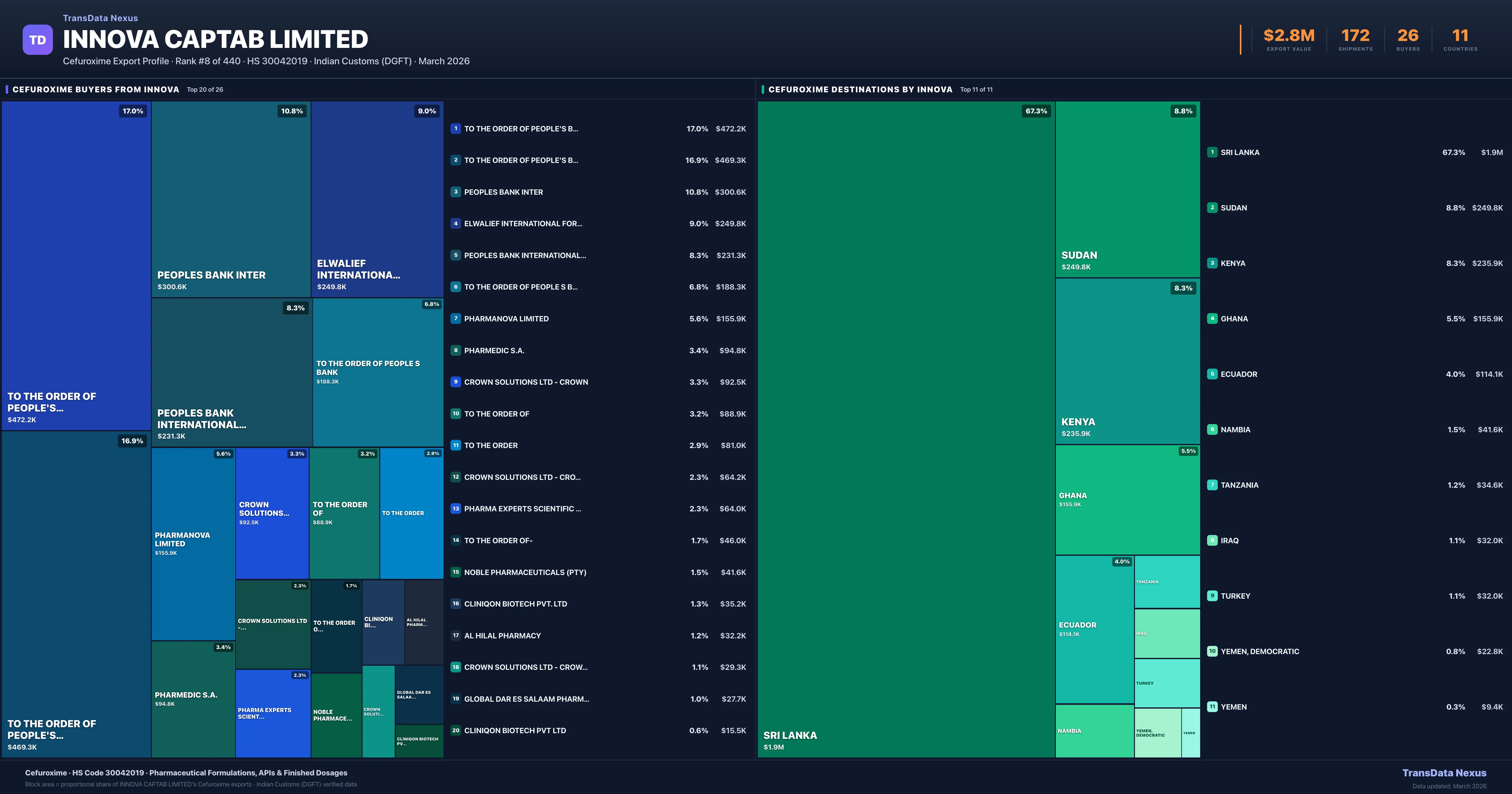 Innova Captab Limited supplies Cefuroxime to 26 buyers globally. The largest buyer is TO THE ORDER OF PEOPLE'S BANK (SRI LANKA), followed by TO THE ORDER OF PEOPLE'S BANK, (SRI LANKA) and PEOPLES BANK INTER (SRI LANKA). These buyers represent pharmaceutical distributors, hospital groups, and government procurement agencies in their respective markets.