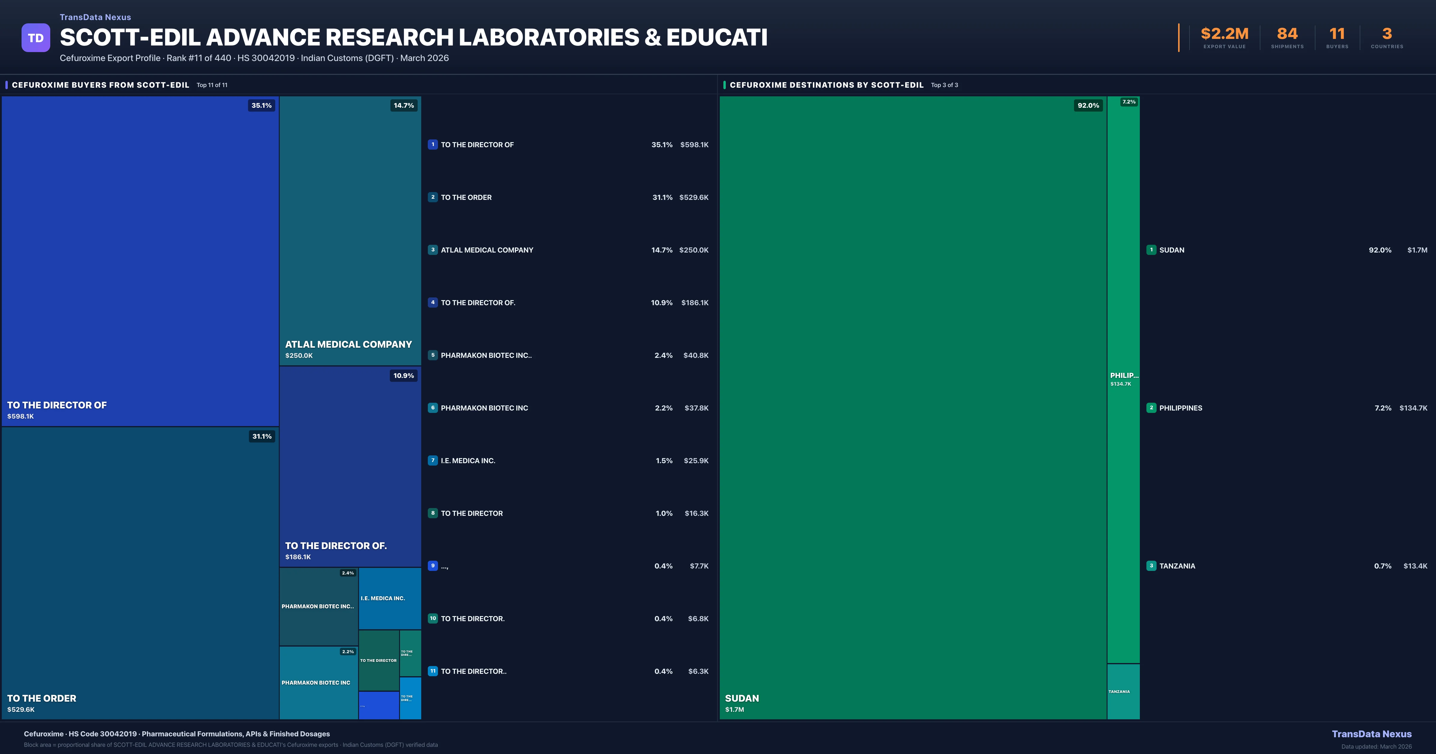 Scott-edil Advance Research Laboratories & Educati exports 4 products worth $7.9M. Beyond Cefuroxime, top products include Ceftriaxone, Cefpodoxime, Ceftazidime. View the complete Scott-edil Advance Research Laboratories & Educati profile for full portfolio analysis.