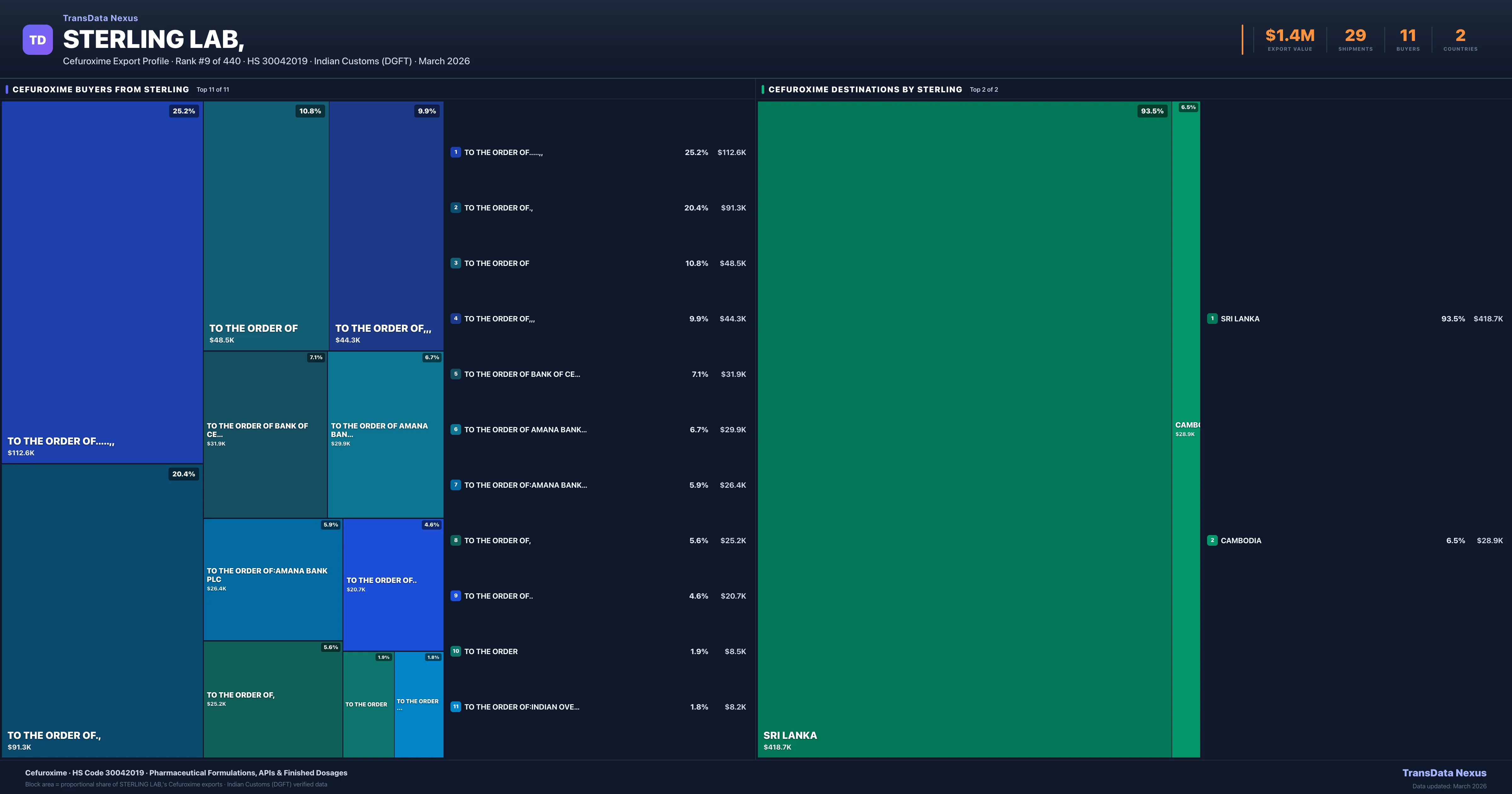 Sterling Lab, supplies Cefuroxime to 11 buyers globally. The largest buyer is TO THE ORDER OF.....,, (SRI LANKA), followed by TO THE ORDER OF., (SRI LANKA) and TO THE ORDER OF (SRI LANKA). These buyers represent pharmaceutical distributors, hospital groups, and government procurement agencies in their respective markets.