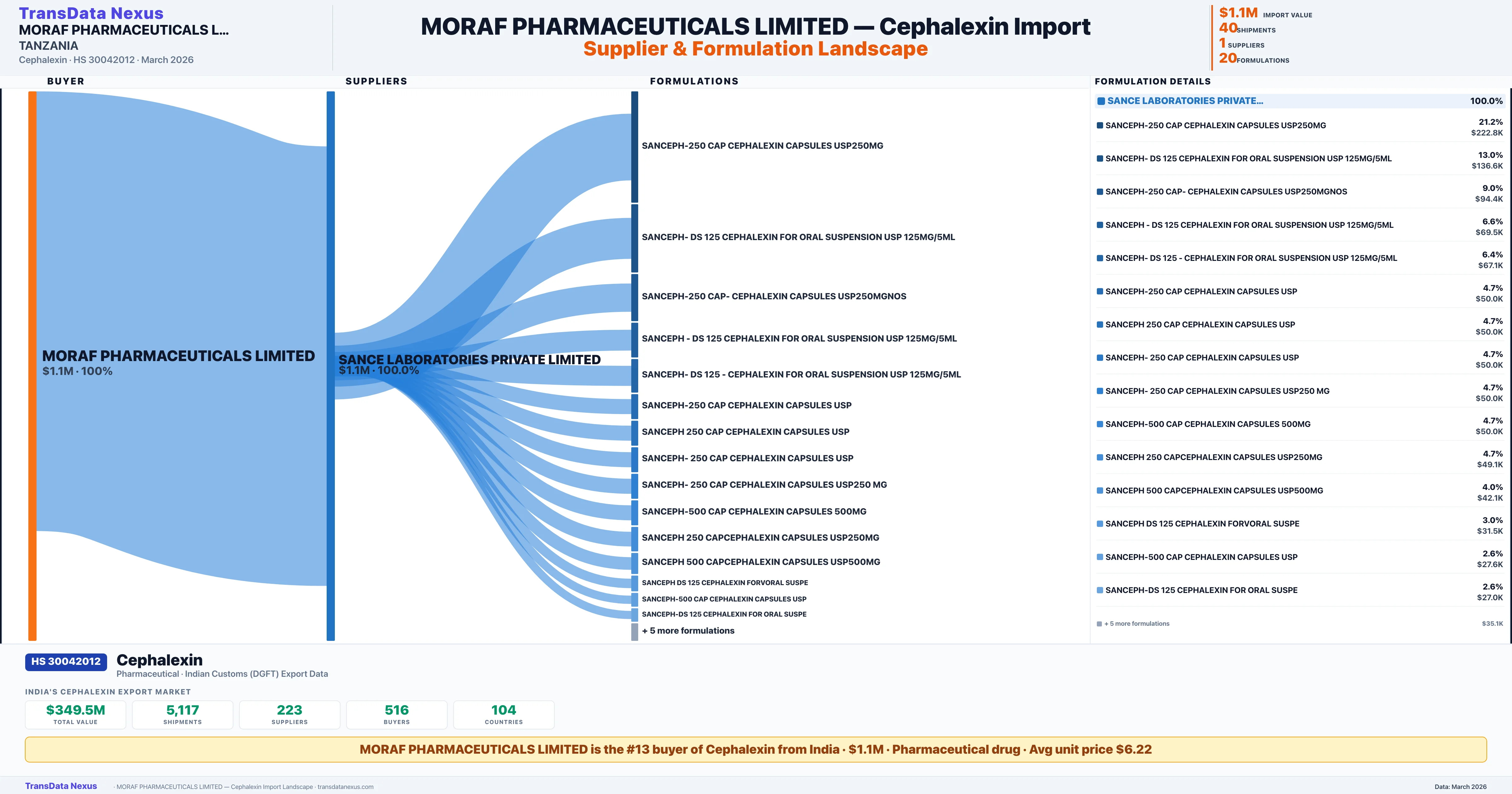 MORAF PHARMACEUTICALS LIMITED sources Cephalexin from 1 verified Indian supplier: SANCE LABORATORIES PRIVATE LIMITED ($1.1M, 100.0%). This is based on 40 customs records.