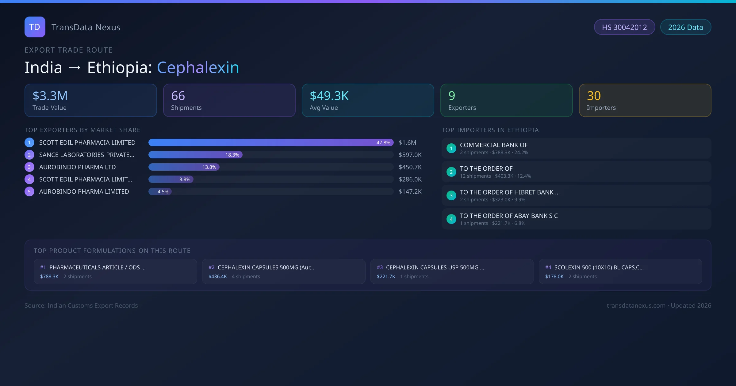 The India to Ethiopia Cephalexin corridor is one of India's established pharmaceutical export routes, with 66 shipments documented worth a combined $3.3M USD. The route is dominated by SCOTT EDIL PHARMACIA LIMITED, which alone accounts for roughly 48% of all export value, reflecting the consolidated nature of India's cephalexin manufacturing sector.