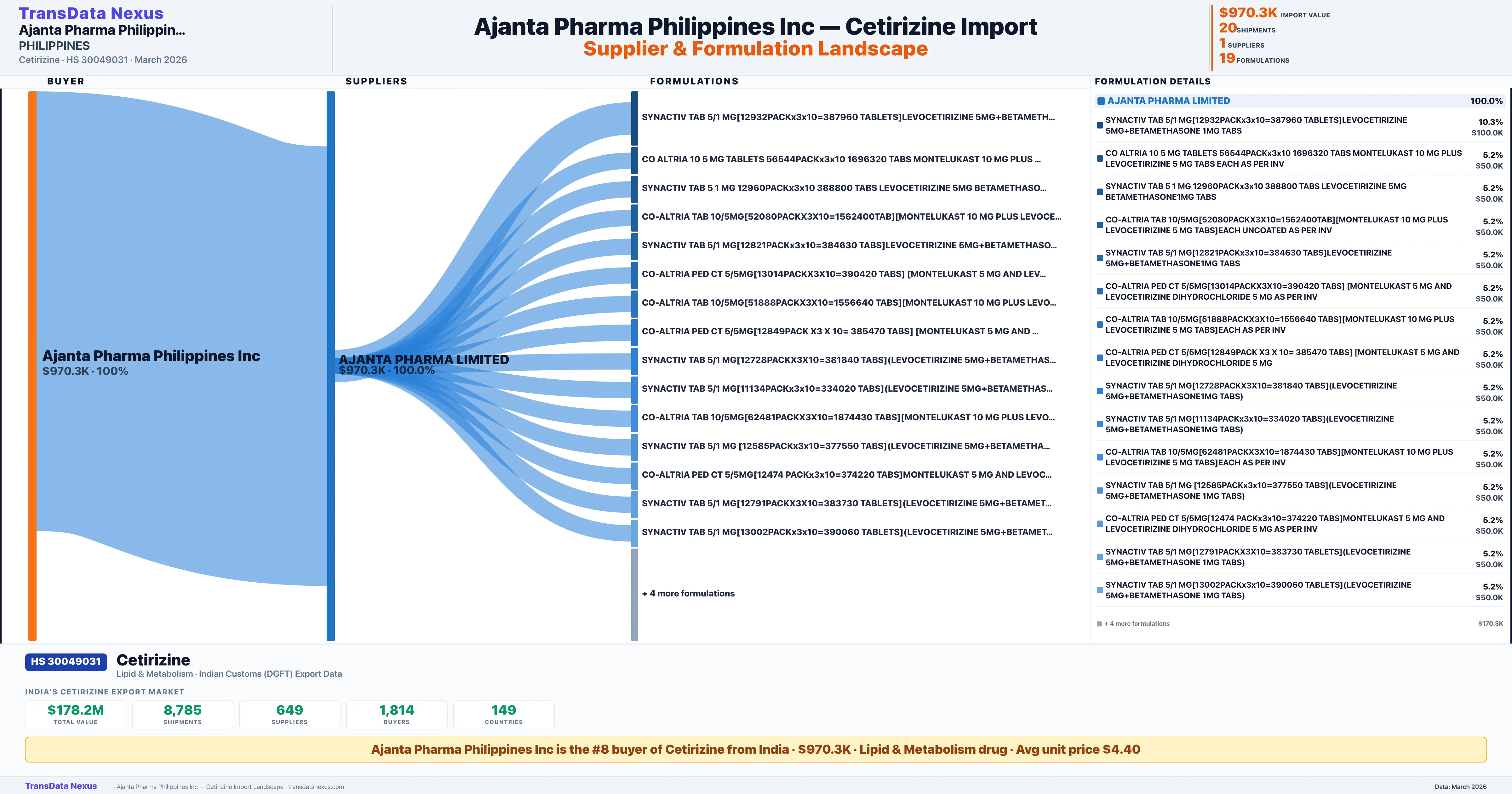 AJANTA PHARMA PHILIPPINES INC sources Cetirizine from 1 verified Indian supplier: AJANTA PHARMA LIMITED ($970.3K, 100.0%). This is based on 20 customs records.
