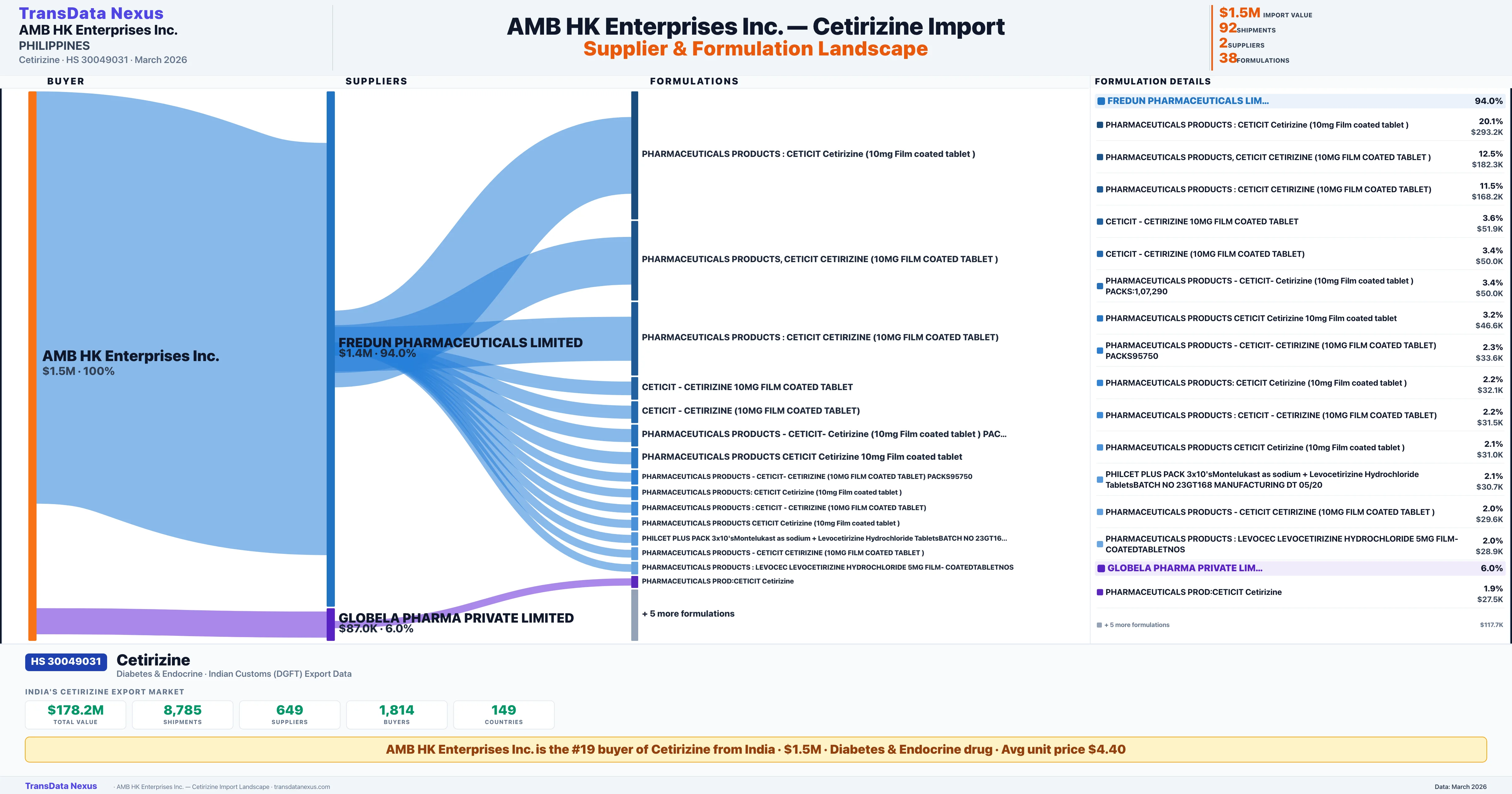 AMB HK ENTERPRISES INC. sources Cetirizine from 2 verified Indian suppliers: FREDUN PHARMACEUTICALS LIMITED ($1.4M, 94.0%), GLOBELA PHARMA PRIVATE LIMITED ($87.0K, 6.0%). This is based on 92 customs records.