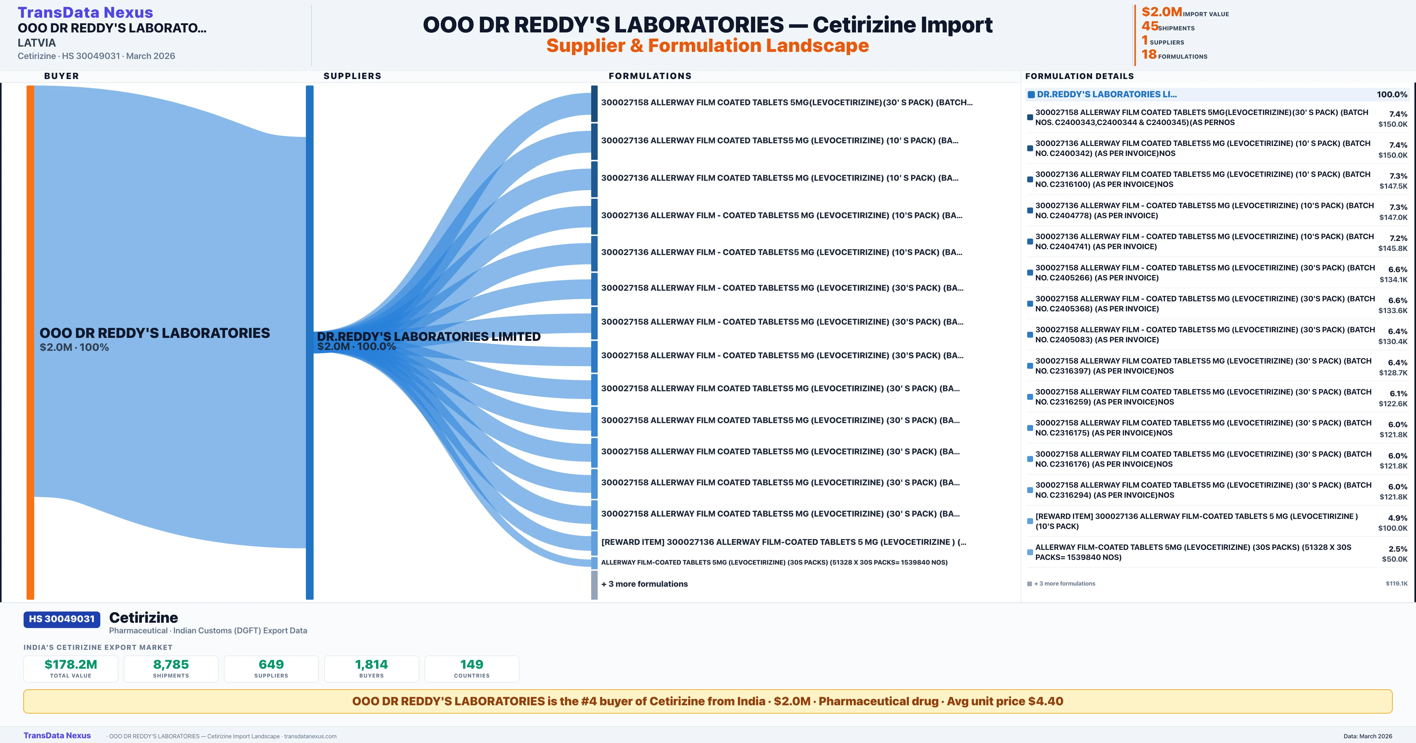OOO DR REDDY'S LABORATORIES sources Cetirizine from 1 verified Indian supplier: DR.REDDY'S LABORATORIES LIMITED ($2.0M, 100.0%). This is based on 45 customs records.