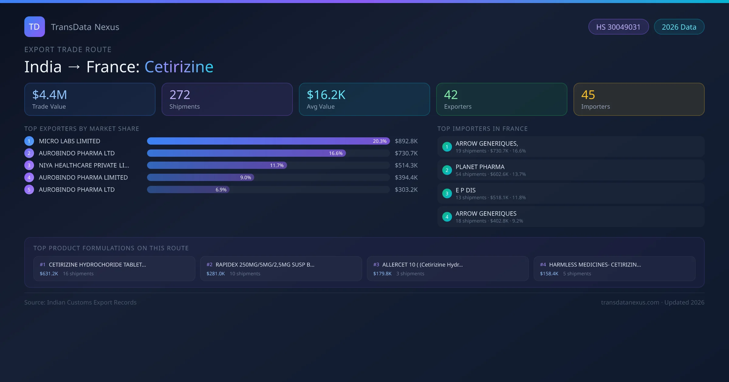 The India to France Cetirizine corridor is one of India's established pharmaceutical export routes, with 272 shipments documented worth a combined $4.4M USD. The route is dominated by MICRO LABS LIMITED, which alone accounts for roughly 20% of all export value, reflecting the consolidated nature of India's cetirizine manufacturing sector.