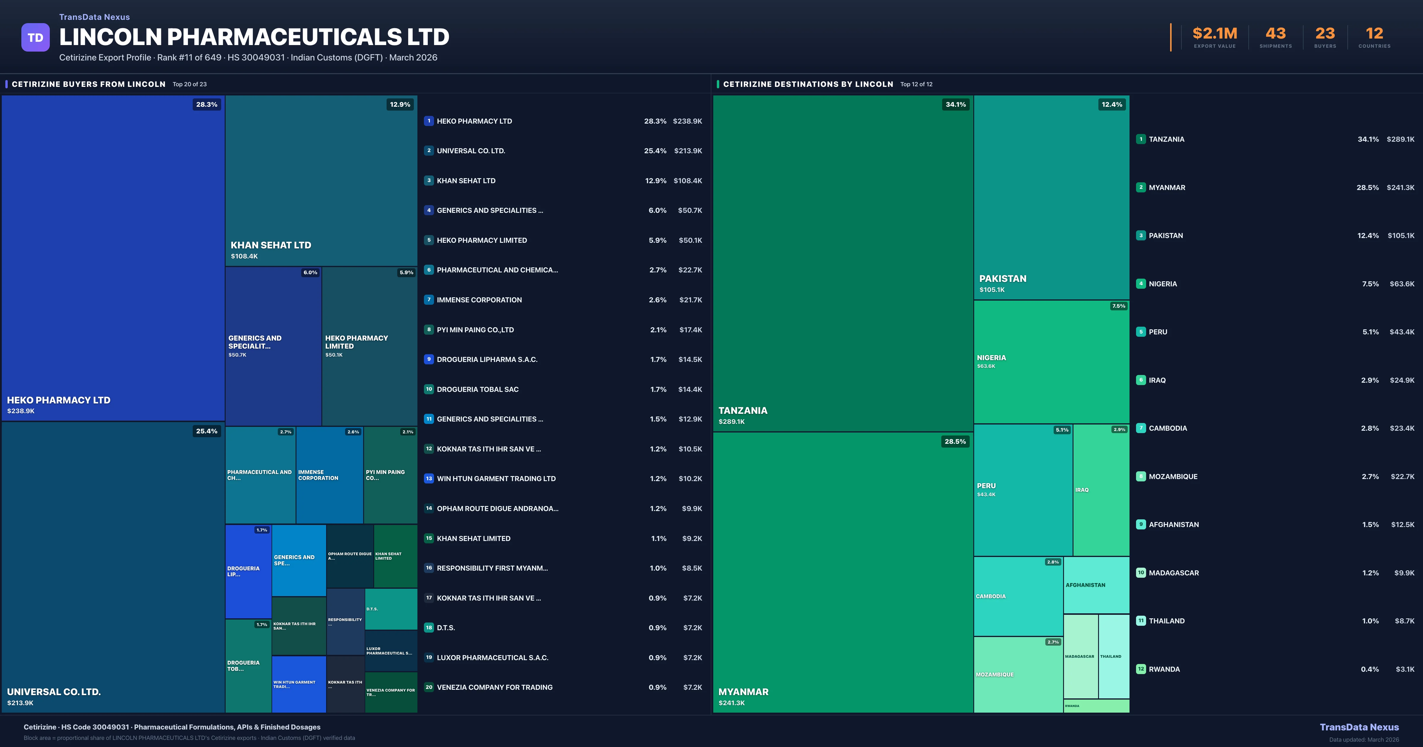 - 4.Verified Records: This page is backed by 58 individual customs records matching Lincoln Pharmaceuticals Ltd exporting Cetirizine, covering 35 formulations to 12 countries via 23 buyers.