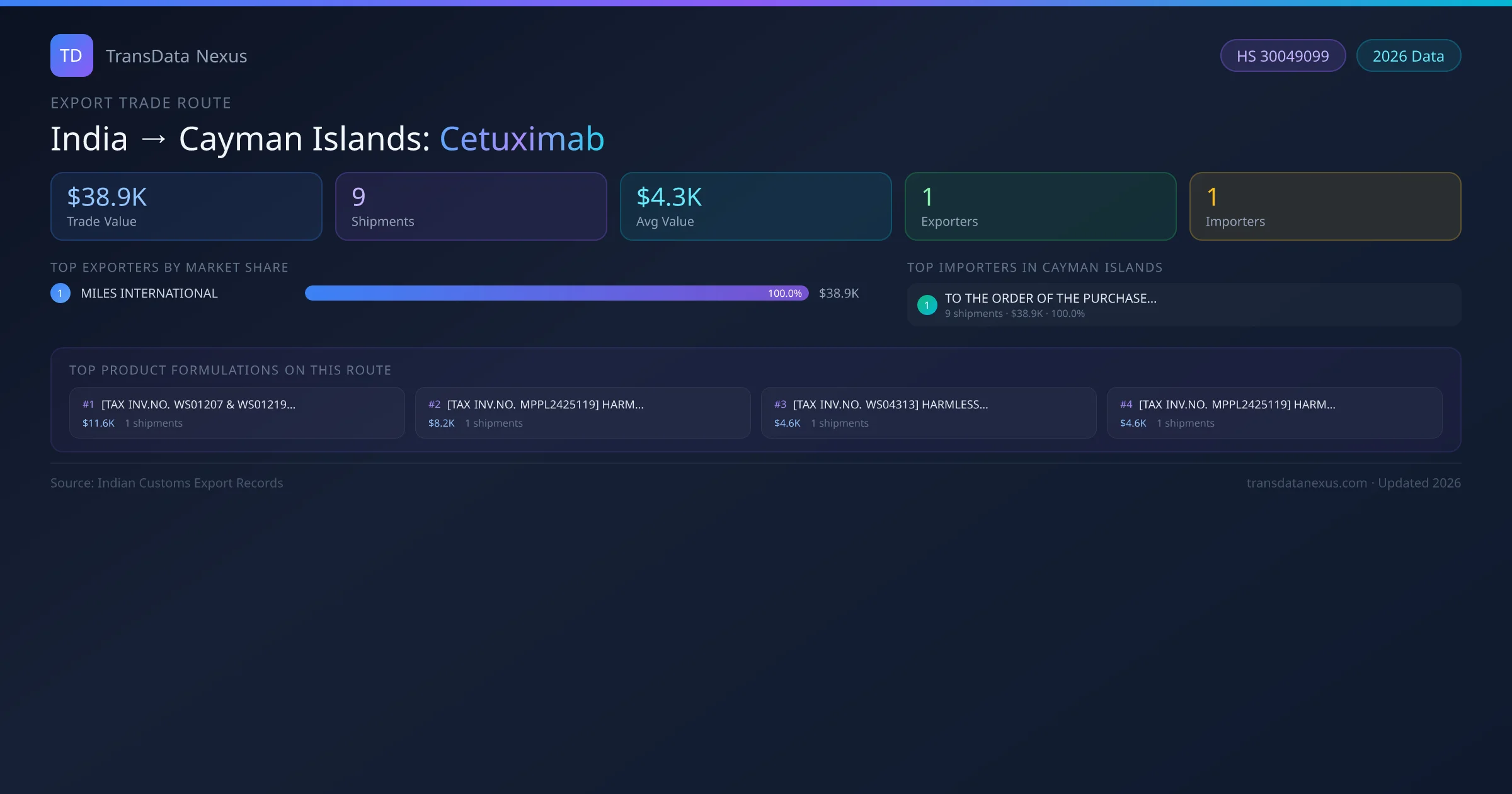 India has recorded 9 verified shipments of Cetuximab exported to Cayman Islands, representing a combined trade value of $38.9K USD. This corridor is served by 1 active Indian exporters, with an average shipment value of $4.3K USD. The leading Indian exporter is MILES INTERNATIONAL, which accounts for 100% of total export value with 9 shipments worth $38.9K USD. On the buying side, TO THE ORDER OF THE PURCHASE MANAGE is the largest importer in Cayman Islands with $38.9K USD in purchases. All data sourced from Indian Customs (DGFT) shipping bill records. Values reported in FOB USD.