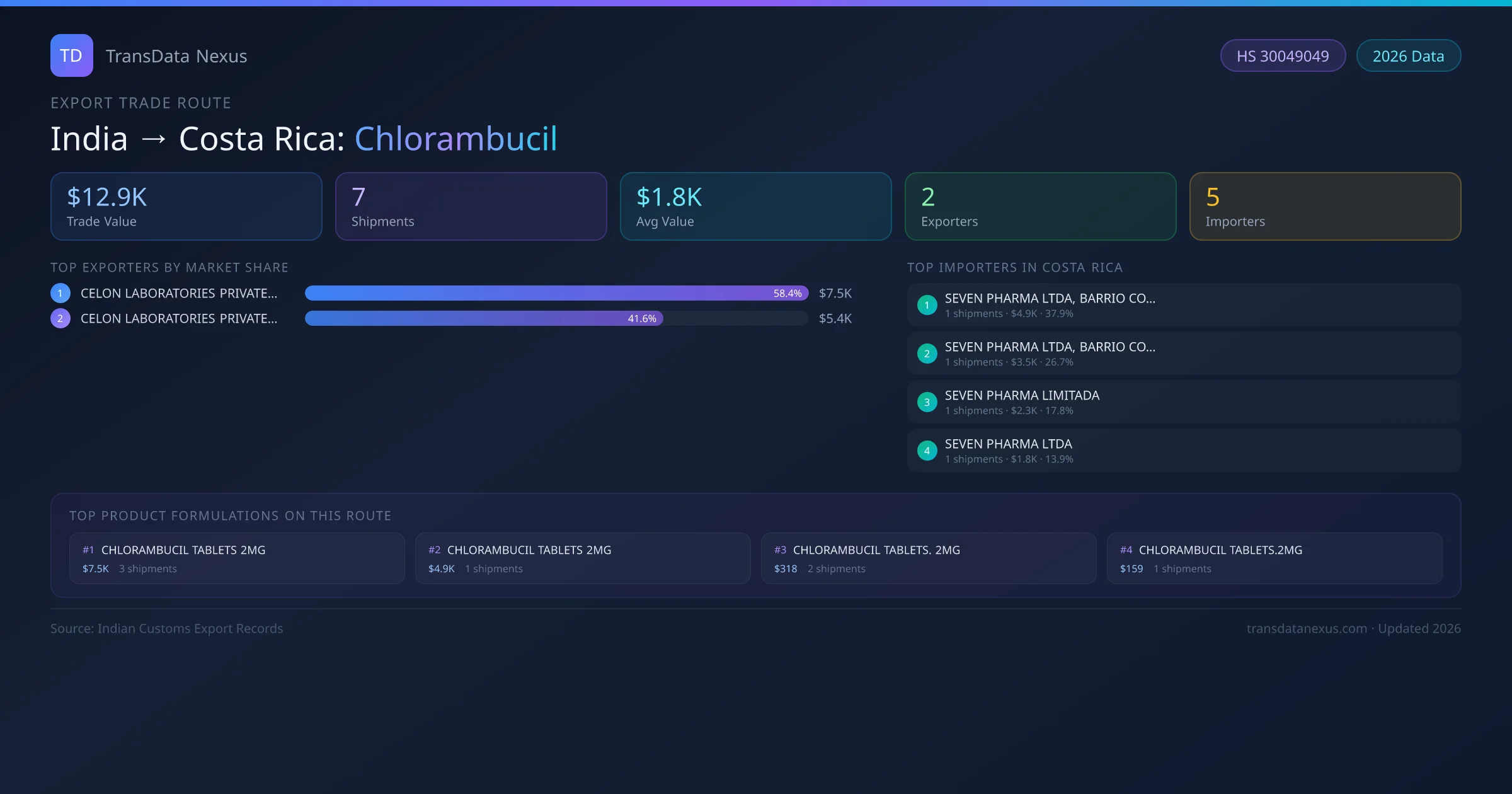 The India to Costa Rica Chlorambucil corridor is one of India's established pharmaceutical export routes, with 7 shipments documented worth a combined $12.9K USD. The route is dominated by CELON LABORATORIES PRIVATE LIMITED, which alone accounts for roughly 58% of all export value, reflecting the consolidated nature of India's chlorambucil manufacturing sector.