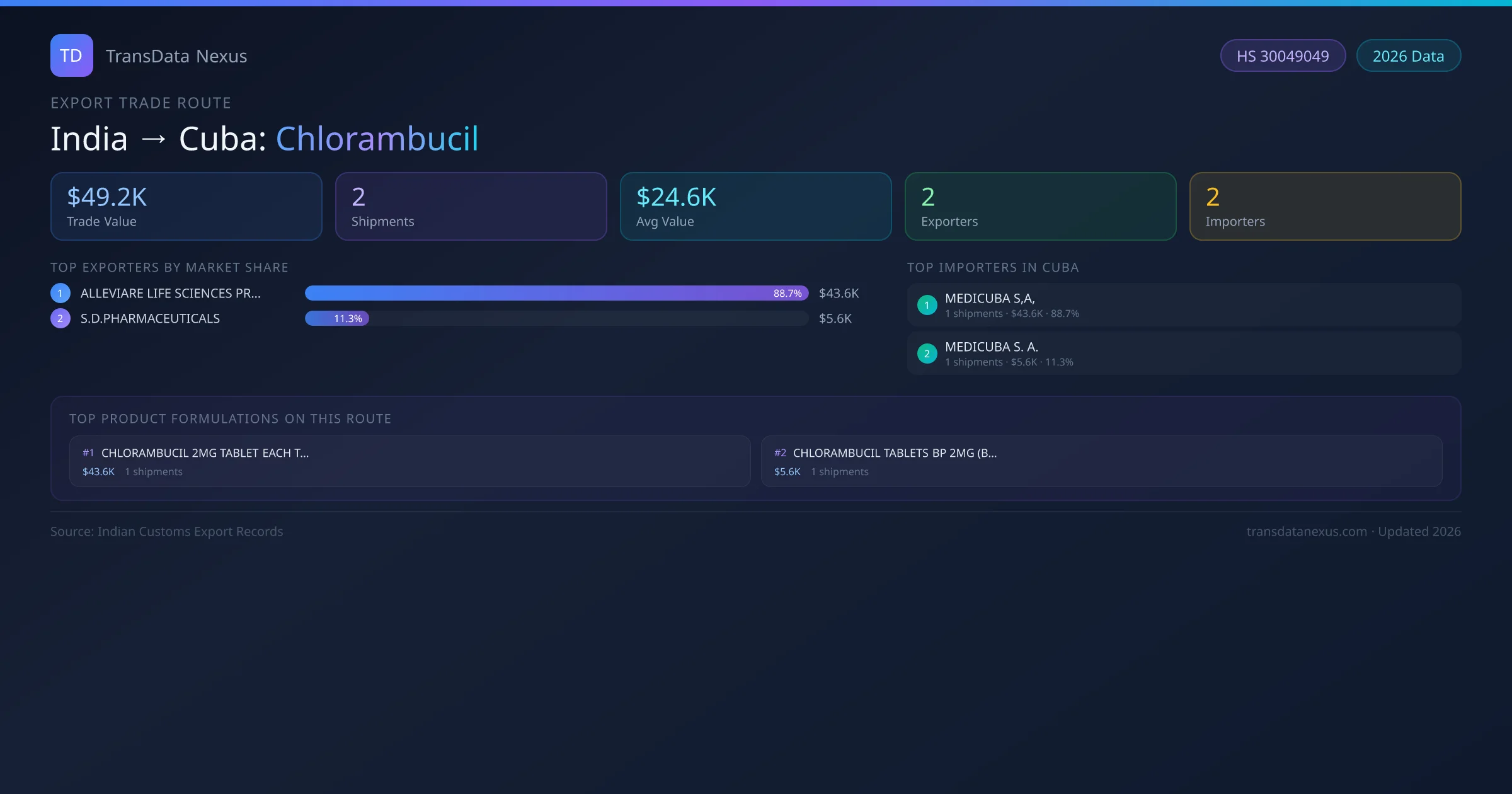 The India to Cuba Chlorambucil corridor is one of India's established pharmaceutical export routes, with 2 shipments documented worth a combined $49.2K USD. The route is dominated by ALLEVIARE LIFE SCIENCES PRIVATE LIMITED , which alone accounts for roughly 89% of all export value, reflecting the consolidated nature of India's chlorambucil manufacturing sector.
