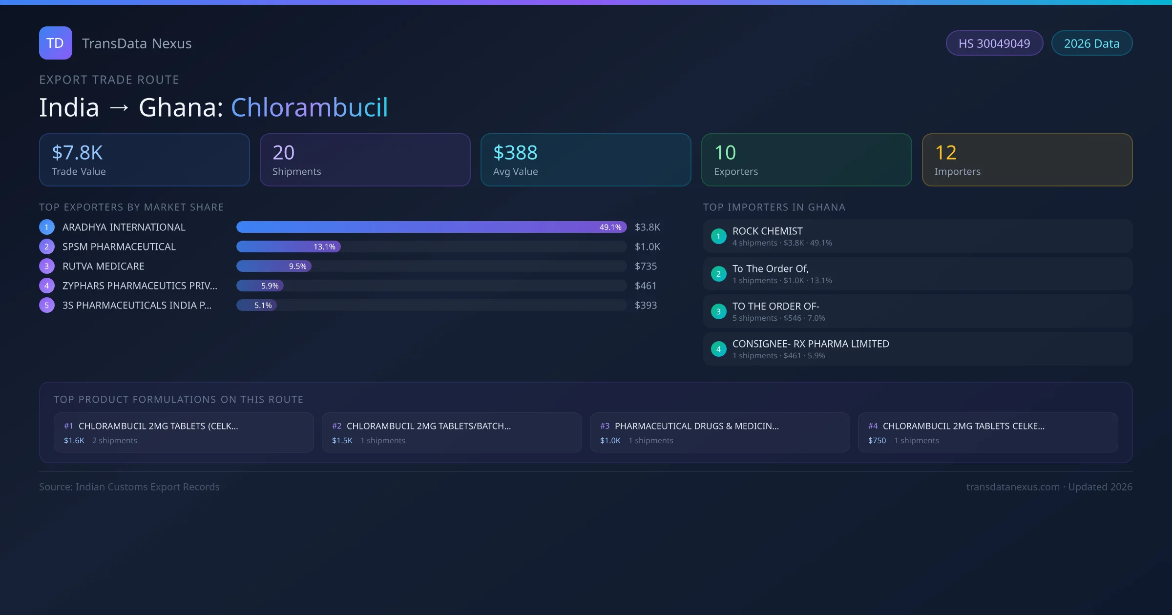 India has recorded 20 verified shipments of Chlorambucil exported to Ghana, representing a combined trade value of $7.8K USD. This corridor is served by 10 active Indian exporters, with an average shipment value of $388 USD. The leading Indian exporter is ARADHYA INTERNATIONAL, which accounts for 49% of total export value with 4 shipments worth $3.8K USD. On the buying side, ROCK CHEMIST is the largest importer in Ghana with $3.8K USD in purchases. The top 3 suppliers — ARADHYA INTERNATIONAL, SPSM PHARMACEUTICAL, RUTVA MEDICARE — together control 72% of total trade value on this route. All data sourced from Indian Customs (DGFT) shipping bill records. Values reported in FOB USD.