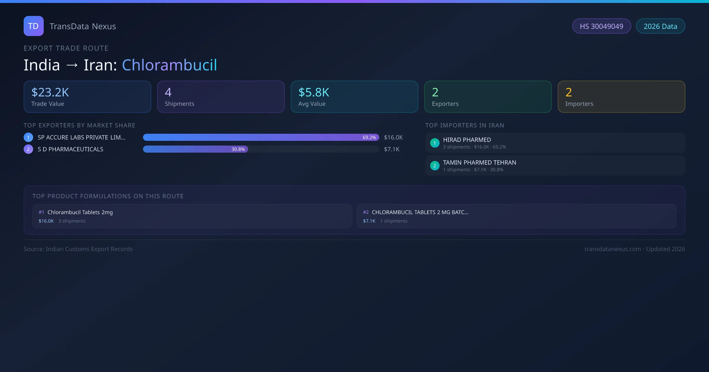 India has recorded 4 verified shipments of Chlorambucil exported to Iran, representing a combined trade value of $23.2K USD. This corridor is served by 2 active Indian exporters, with an average shipment value of $5.8K USD. The leading Indian exporter is SP ACCURE LABS PRIVATE LIMITED, which accounts for 69% of total export value with 3 shipments worth $16.0K USD. On the buying side, HIRAD PHARMED is the largest importer in Iran with $16.0K USD in purchases. All data sourced from Indian Customs (DGFT) shipping bill records. Values reported in FOB USD.