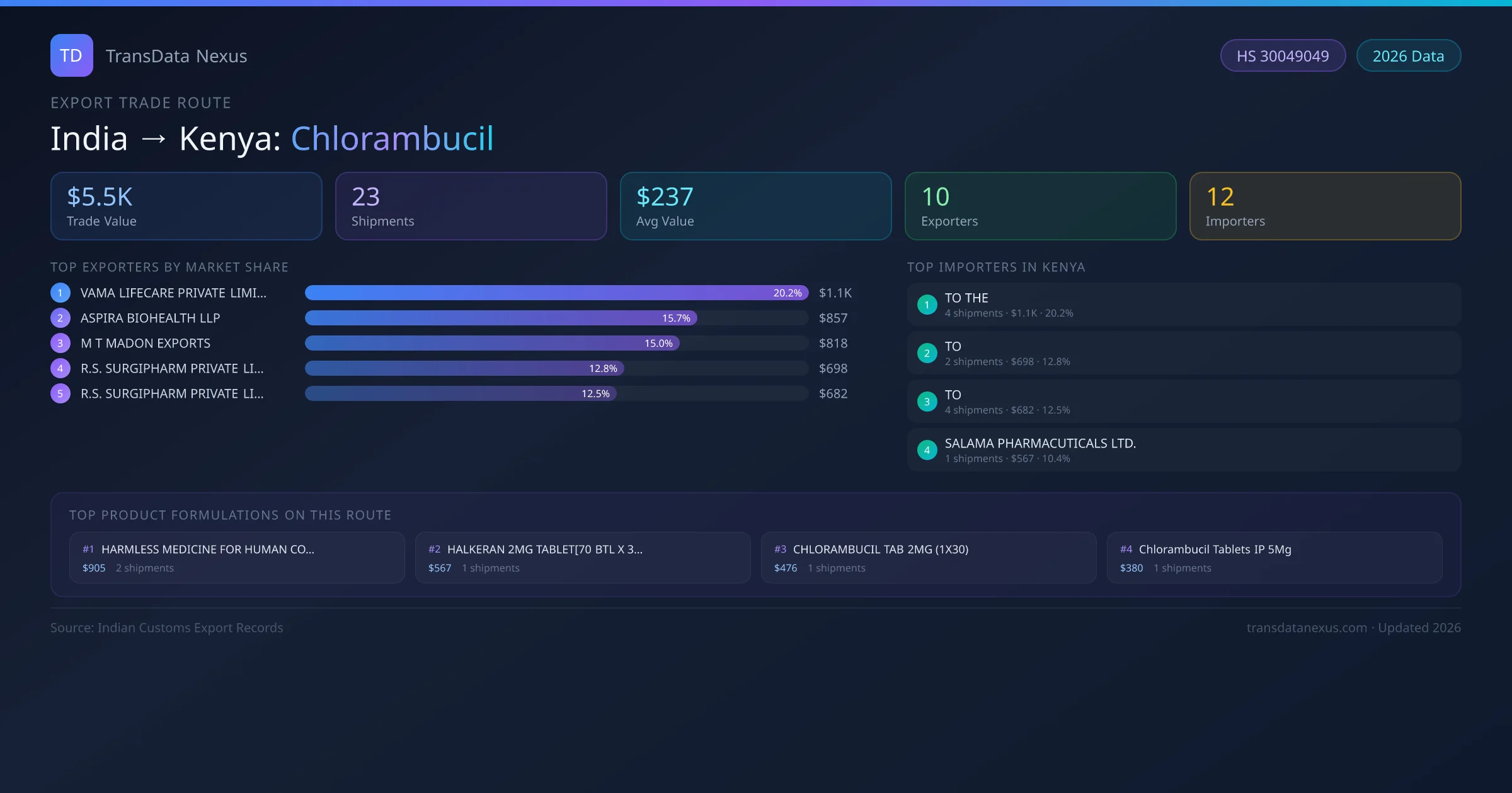 On the import side, key buyers of Indian chlorambucil in Kenya include TO THE, TO , TO and 9 others. TO THE is the single largest importer with 4 shipments valued at $1.1K USD.