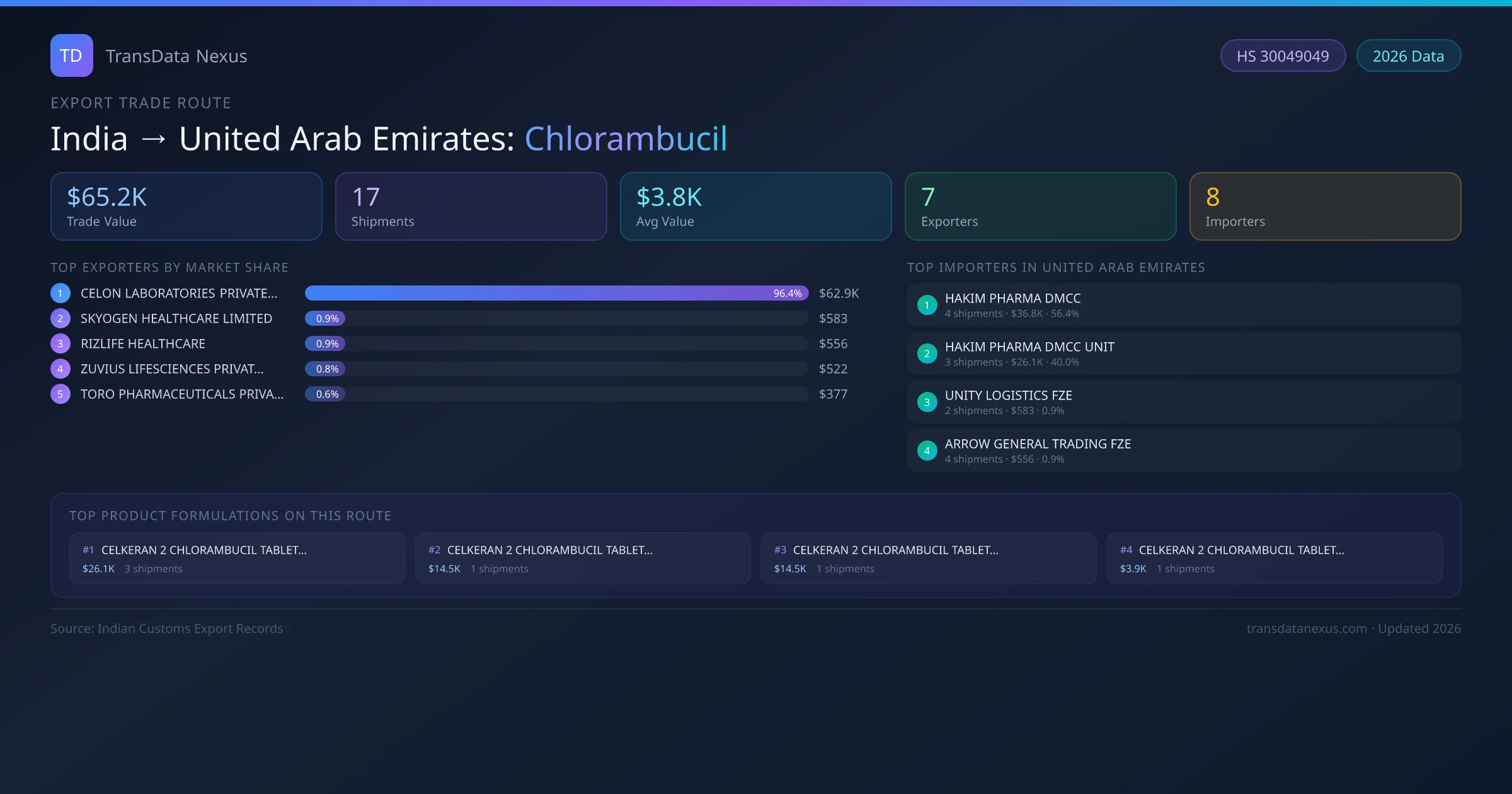 India has recorded 17 verified shipments of Chlorambucil exported to United Arab Emirates, representing a combined trade value of $65.2K USD. This corridor is served by 7 active Indian exporters, with an average shipment value of $3.8K USD. The leading Indian exporter is CELON LABORATORIES PRIVATE LIMITED, which accounts for 96% of total export value with 7 shipments worth $62.9K USD. On the buying side, HAKIM PHARMA DMCC is the largest importer in United Arab Emirates with $36.8K USD in purchases. The top 3 suppliers — CELON LABORATORIES PRIVATE LIMITED, SKYOGEN HEALTHCARE LIMITED, RIZLIFE HEALTHCARE — together control 98% of total trade value on this route. All data sourced from Indian Customs (DGFT) shipping bill records. Values reported in FOB USD.