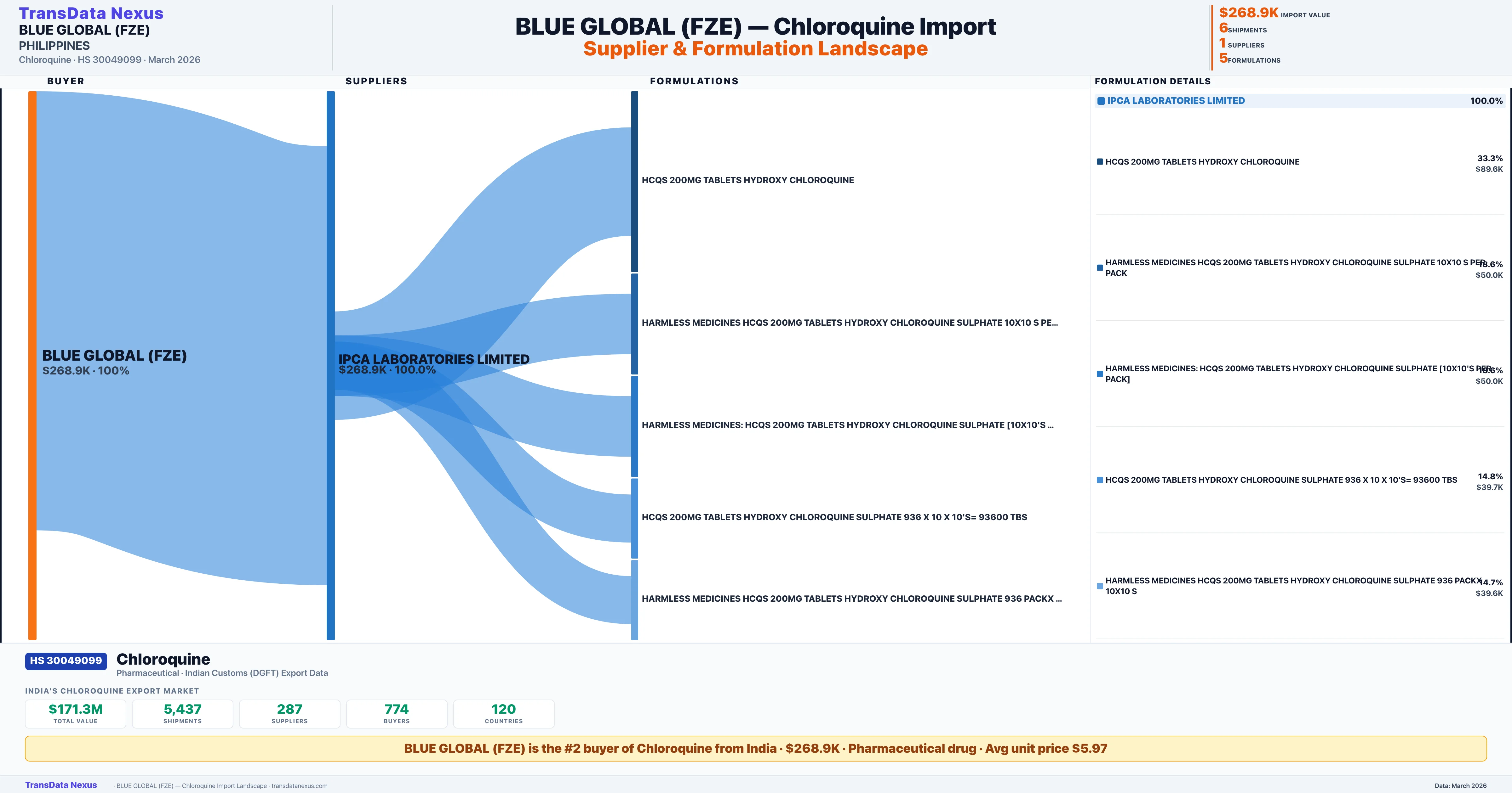 BLUE GLOBAL (FZE) sources Chloroquine from 1 verified Indian supplier: IPCA LABORATORIES LIMITED ($268.9K, 100.0%). This is based on 6 customs records.