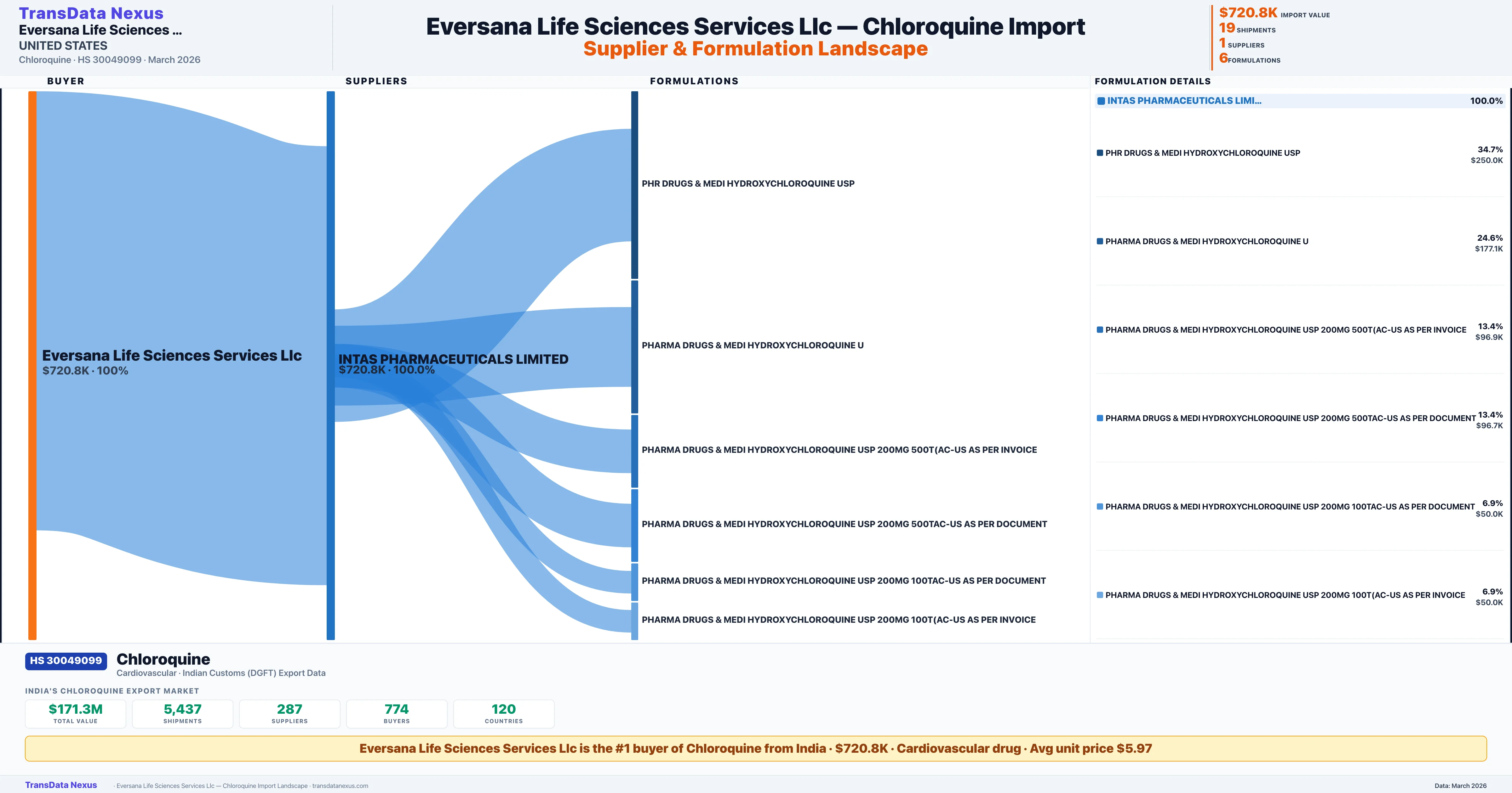 EVERSANA LIFE SCIENCES SERVICES,LLC sources Chloroquine from 1 verified Indian supplier: INTAS PHARMACEUTICALS LIMITED ($720.8K, 100.0%). This is based on 19 customs records.