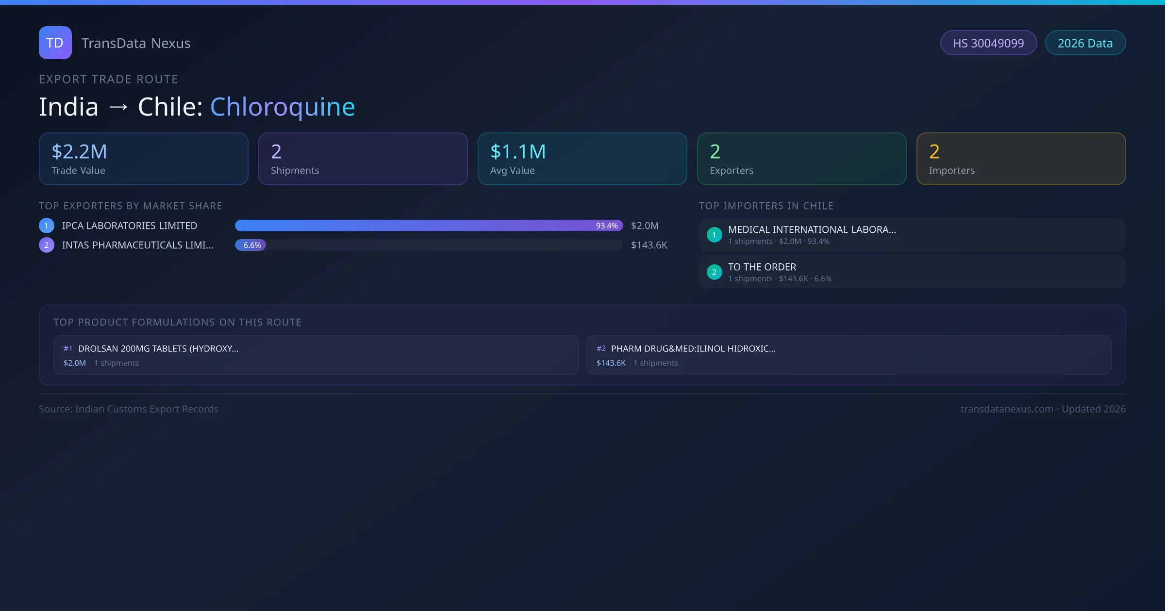 The India to Chile Chloroquine corridor is one of India's established pharmaceutical export routes, with 2 shipments documented worth a combined $2.2M USD. The route is dominated by IPCA LABORATORIES LIMITED, which alone accounts for roughly 93% of all export value, reflecting the consolidated nature of India's chloroquine manufacturing sector.