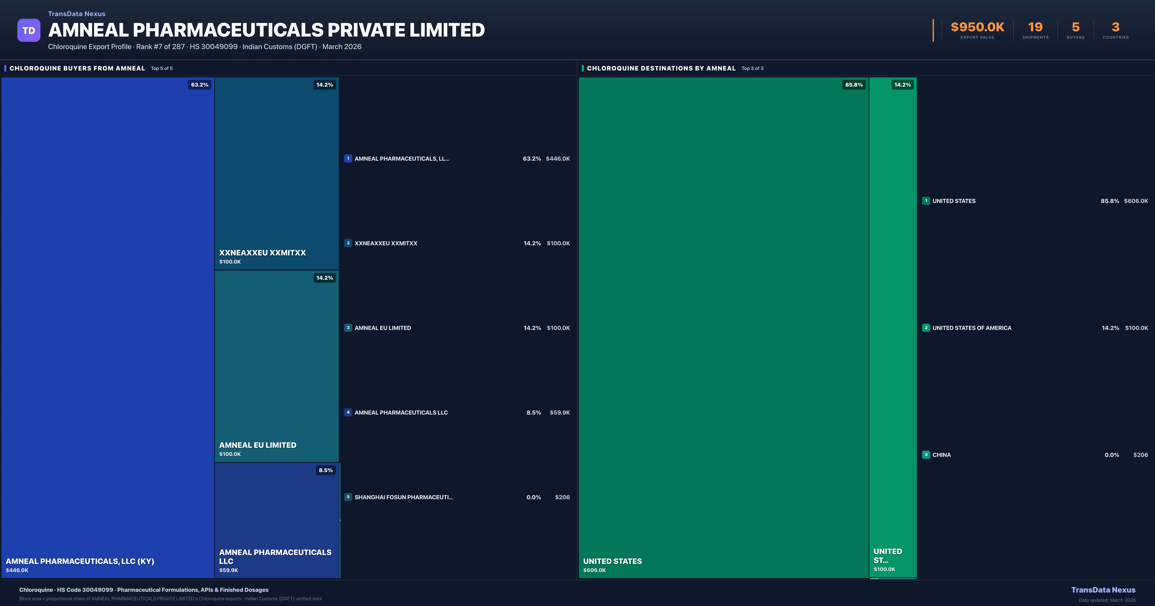 Amneal Pharmaceuticals Private Limited supplies Chloroquine to 5 buyers globally. The largest buyer is AMNEAL PHARMACEUTICALS, LLC (KY) (UNITED STATES), followed by XXNEAXXEU XXMITXX (UNITED STATES OF AMERICA) and AMNEAL EU LIMITED (UNITED STATES). These buyers represent pharmaceutical distributors, hospital groups, and government procurement agencies in their respective markets.