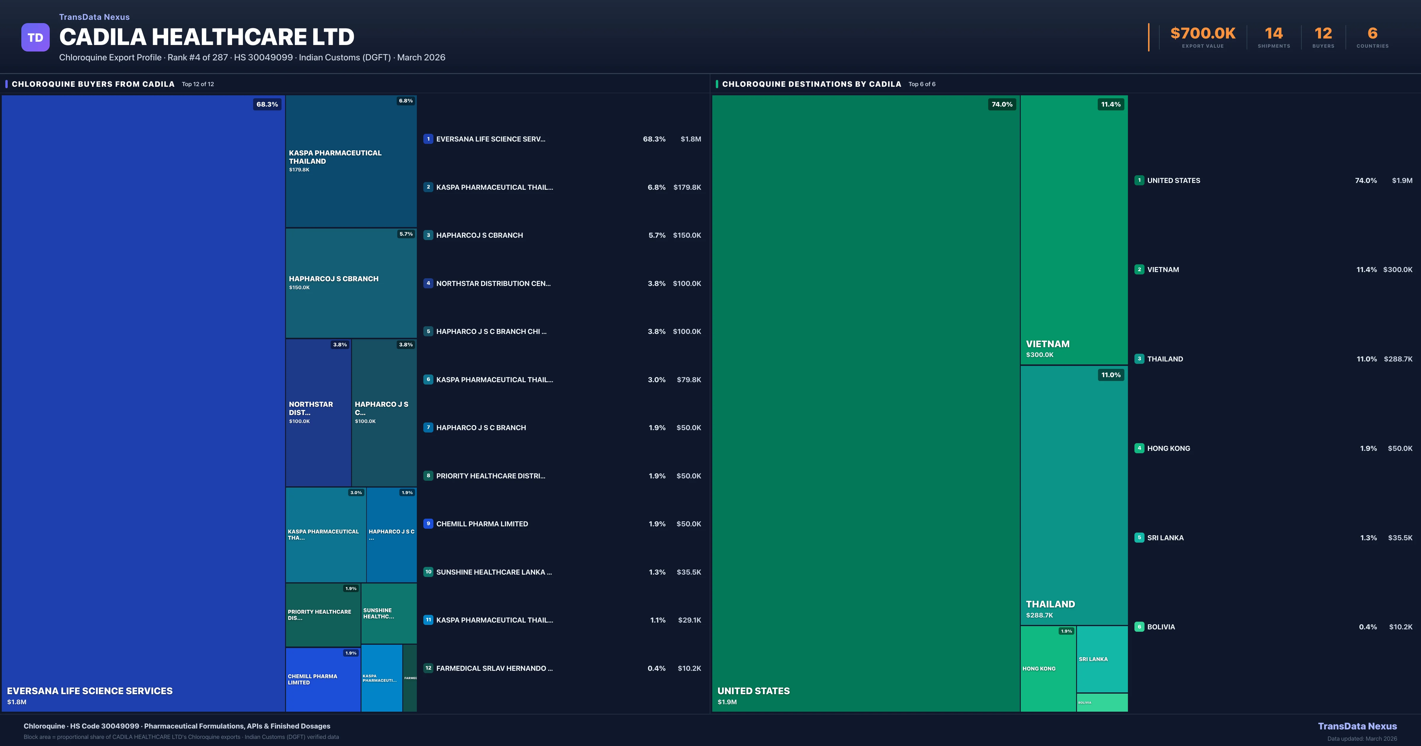 Cadila Healthcare Ltd — Chloroquine Export Profile: Buyers & Destinations