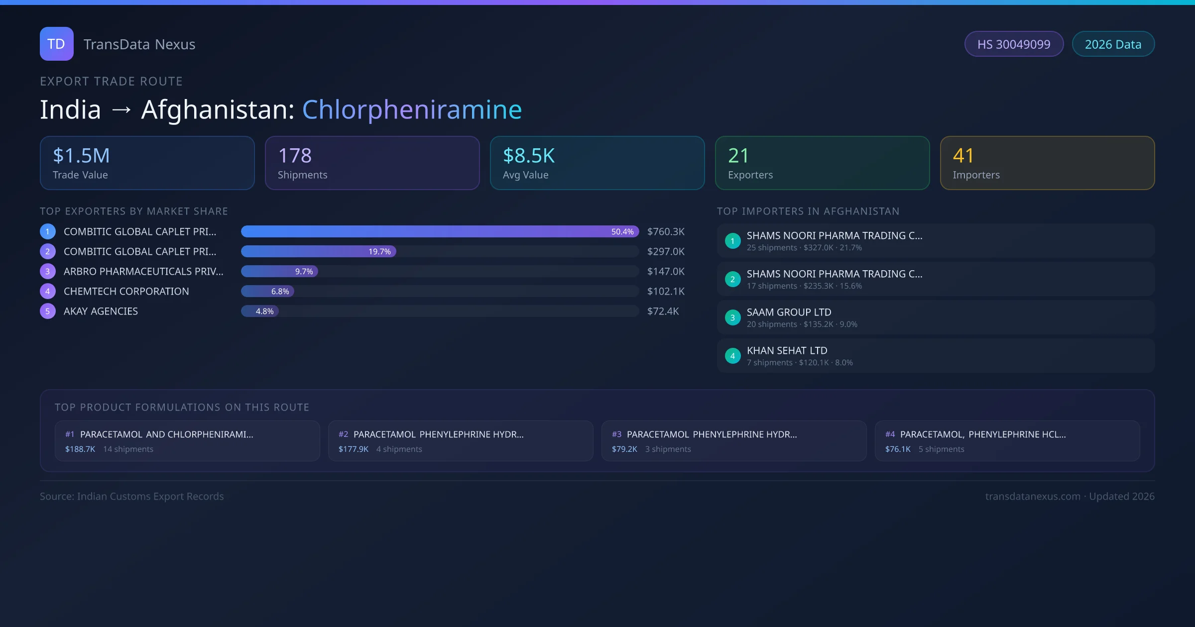 - 1.Route Identification: India to Afghanistan export trade corridor identified from Indian Customs (DGFT) records for Chlorpheniramine.