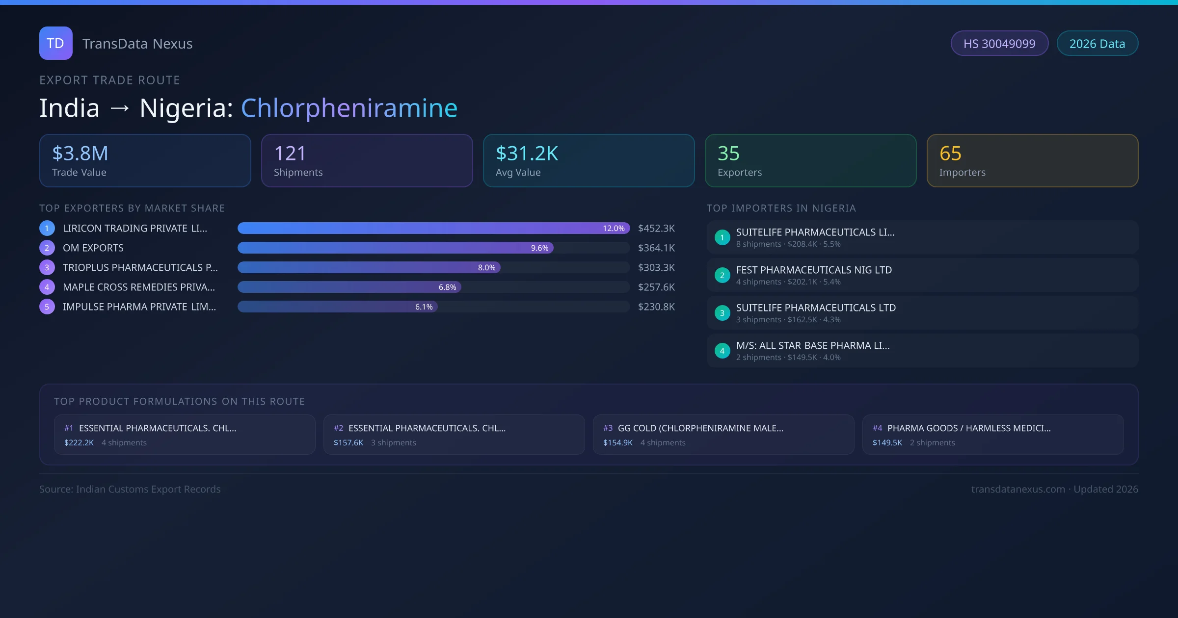India has recorded 121 verified shipments of Chlorpheniramine exported to Nigeria, representing a combined trade value of $3.8M USD. This corridor is served by 35 active Indian exporters, with an average shipment value of $31.2K USD. The leading Indian exporter is LIRICON TRADING PRIVATE LIMITED, which accounts for 12% of total export value with 16 shipments worth $452.3K USD. On the buying side, SUITELIFE PHARMACEUTICALS LIMITED is the largest importer in Nigeria with $208.4K USD in purchases. The top 3 suppliers — LIRICON TRADING PRIVATE LIMITED, OM EXPORTS, TRIOPLUS PHARMACEUTICALS PRIVATE LIMITED — together control 30% of total trade value on this route. All data sourced from Indian Customs (DGFT) shipping bill records. Values reported in FOB USD.