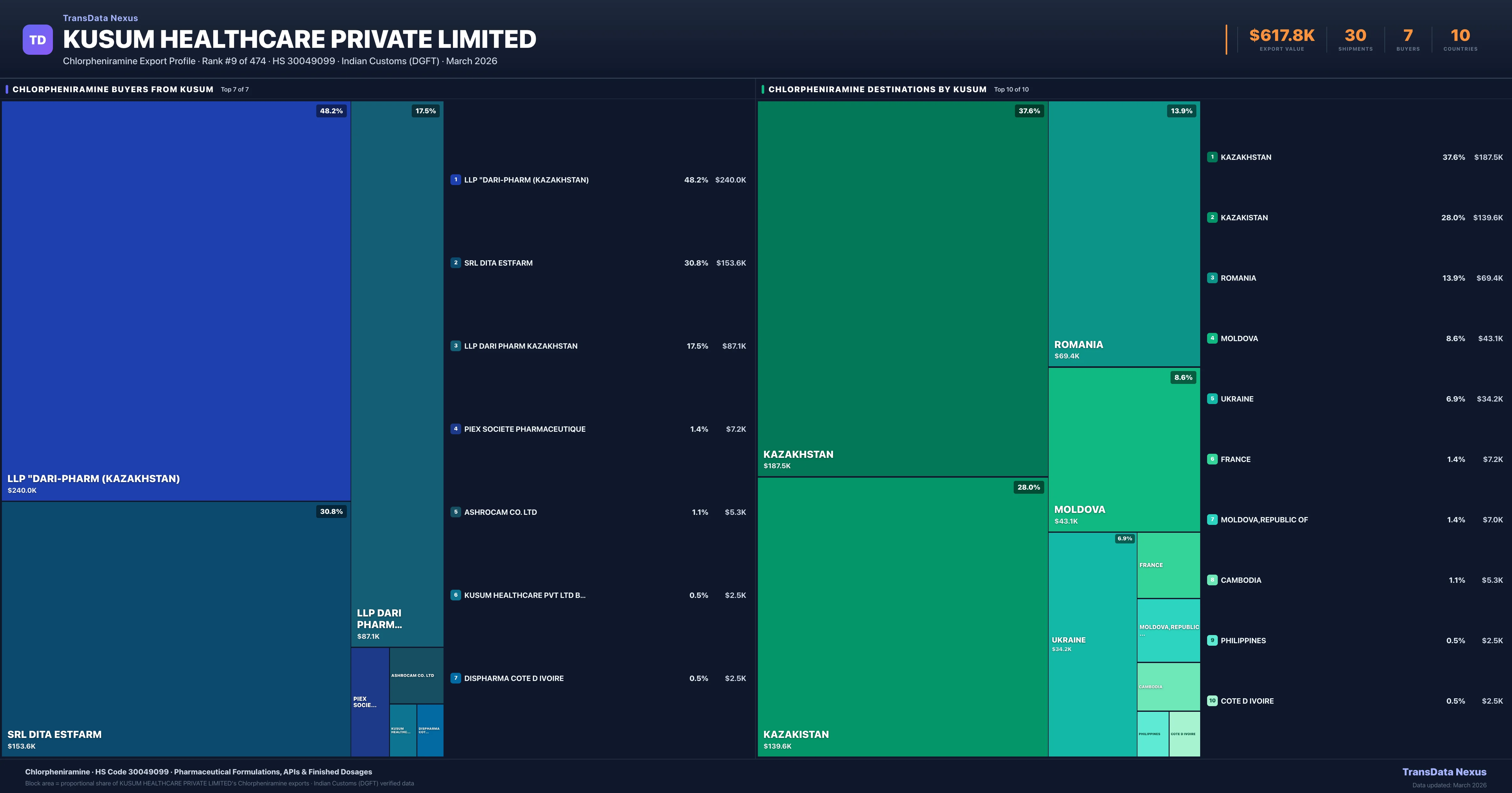 - 4.Verified Records: This page is backed by 30 individual customs records matching Kusum Healthcare Private Limited exporting Chlorpheniramine, covering 16 formulations to 10 countries via 7 buyers.
