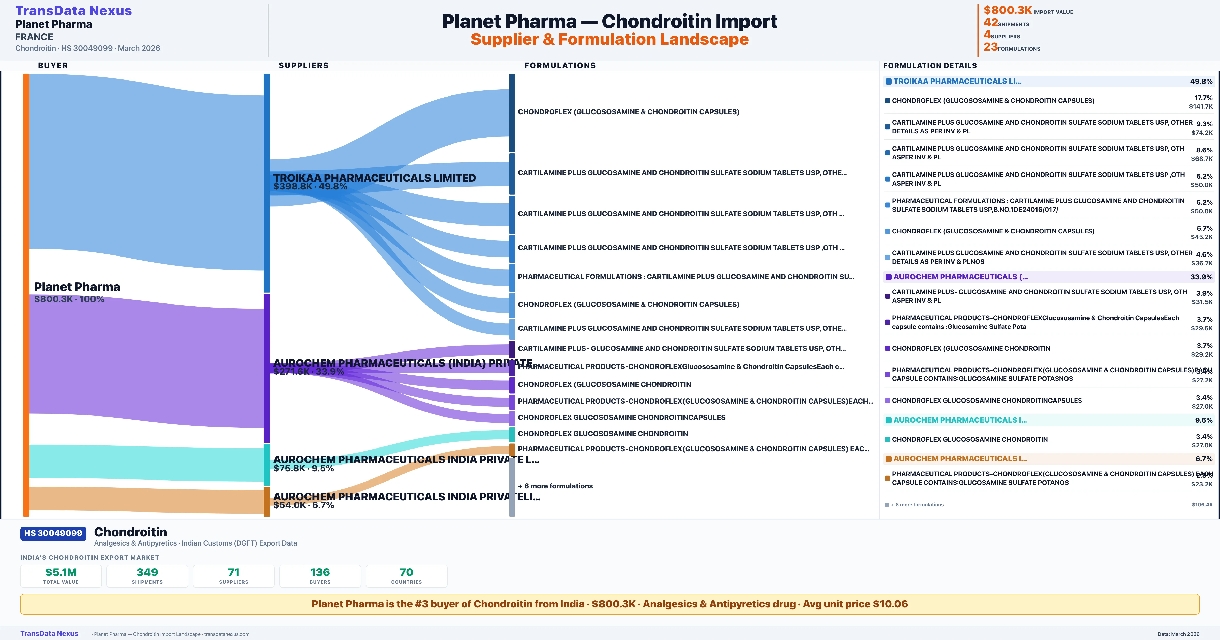 PLANET PHARMA sources Chondroitin from 4 verified Indian suppliers: TROIKAA PHARMACEUTICALS LIMITED ($398.8K, 49.8%), AUROCHEM PHARMACEUTICALS (INDIA) PRIVATELIMITED ($271.6K, 33.9%), AUROCHEM PHARMACEUTICALS INDIA PRIVATE LIMITED ($75.8K, 9.5%), AUROCHEM PHARMACEUTICALS INDIA PRIVATELIMITED ($54.0K, 6.7%). This is based on 42 customs records.