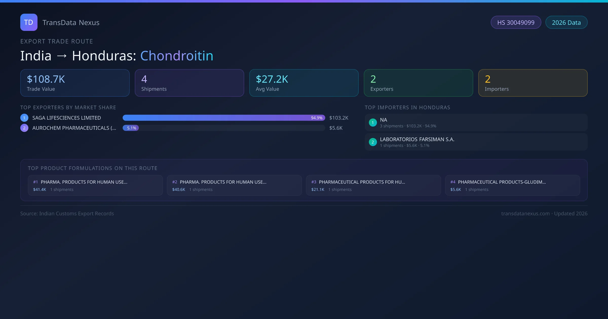 The India to Honduras Chondroitin corridor is one of India's established pharmaceutical export routes, with 4 shipments documented worth a combined $108.7K USD. The route is dominated by SAGA LIFESCIENCES LIMITED, which alone accounts for roughly 95% of all export value, reflecting the consolidated nature of India's chondroitin manufacturing sector.
