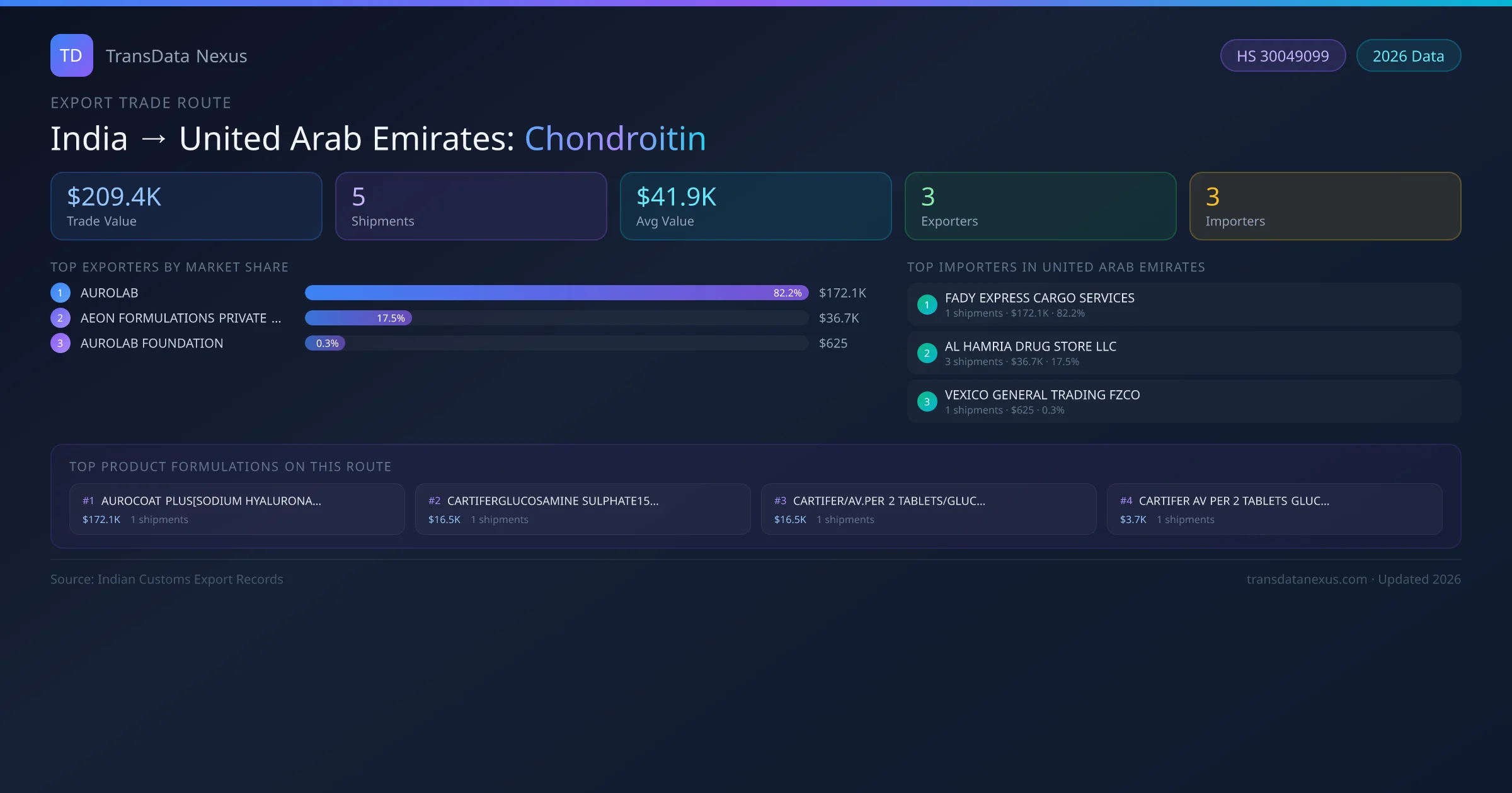 - 1.Route Identification: India to United Arab Emirates export trade corridor identified from Indian Customs (DGFT) records for Chondroitin.