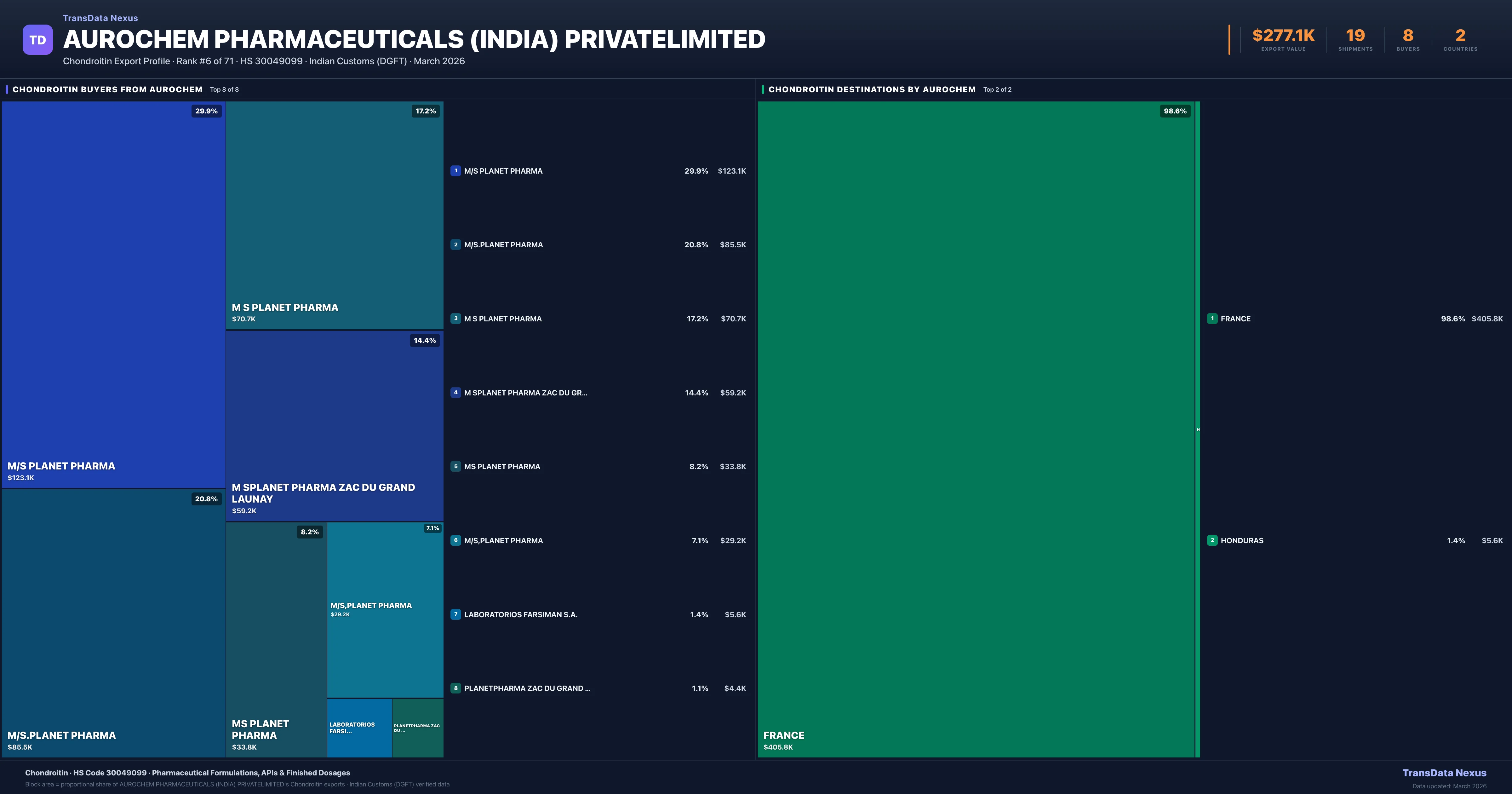 Aurochem Pharmaceuticals (india) Privatelimited supplies Chondroitin to 8 buyers globally. The largest buyer is M/S PLANET PHARMA (FRANCE), followed by M/S.PLANET PHARMA (FRANCE) and M S PLANET PHARMA (FRANCE). These buyers represent pharmaceutical distributors, hospital groups, and government procurement agencies in their respective markets.