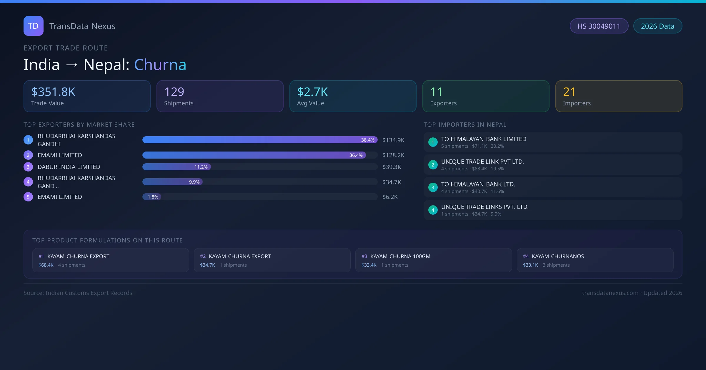 The leading Indian exporters of Churna to Nepal are BHUDARBHAI KARSHANDAS GANDHI, EMAMI LIMITED, DABUR INDIA LIMITED. BHUDARBHAI KARSHANDAS GANDHI holds the largest market share at approximately 38% of total trade value on this route.