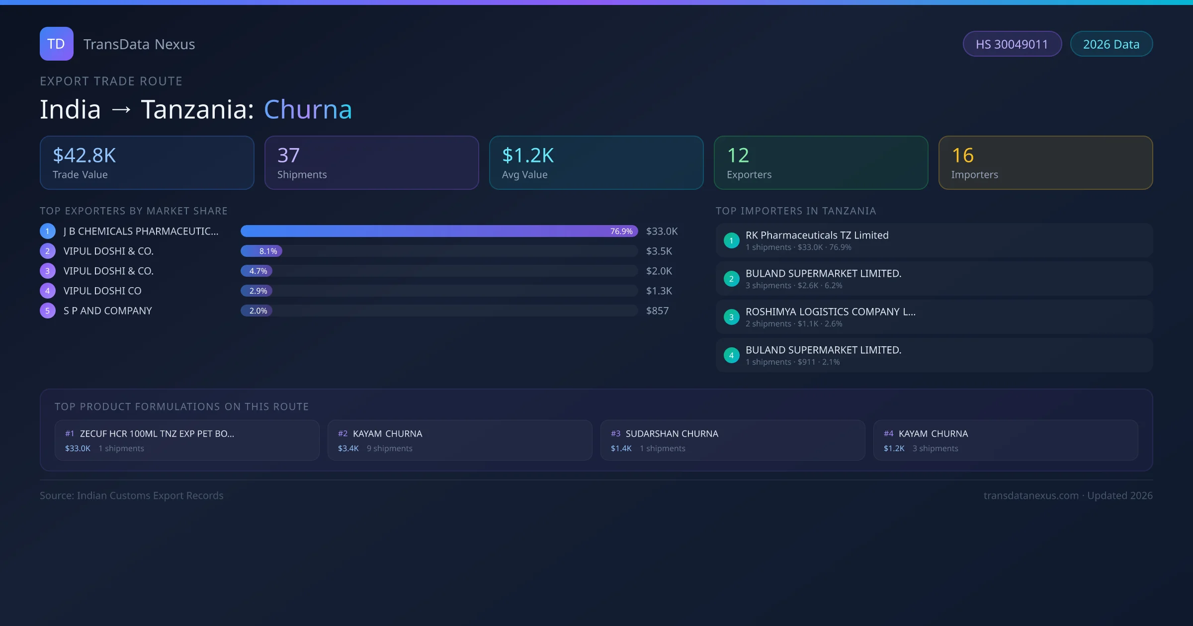 The India to Tanzania Churna corridor is one of India's established pharmaceutical export routes, with 37 shipments documented worth a combined $42.8K USD. The route is dominated by J B CHEMICALS PHARMACEUTICALS LIMITED, which alone accounts for roughly 77% of all export value, reflecting the consolidated nature of India's churna manufacturing sector.