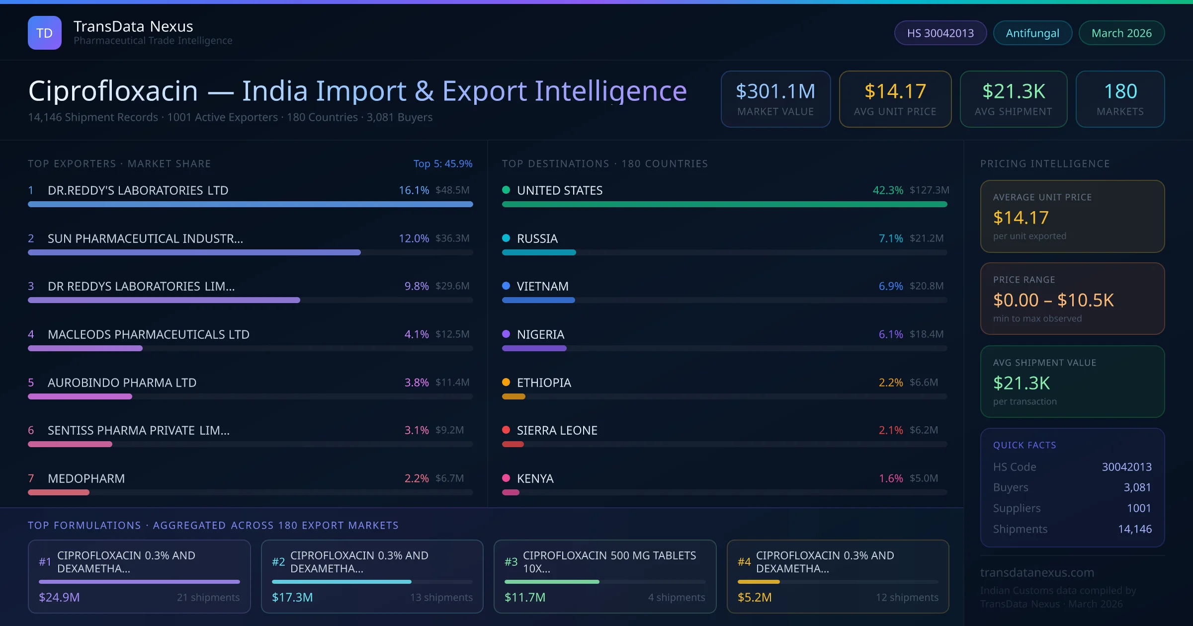 Between 2022 and 2026, India exported $301.1M worth of ciprofloxacin across 14,146 verified shipments to 180 countries — covering 92% of world markets in the Antibiotics segment. The largest destination is UNITED STATES (42.3%). DR.REDDY'S LABORATORIES LTD leads with a 16.1% share. All figures are drawn from Indian Customs (DGFT) shipping bill records spanning four years of trade activity.