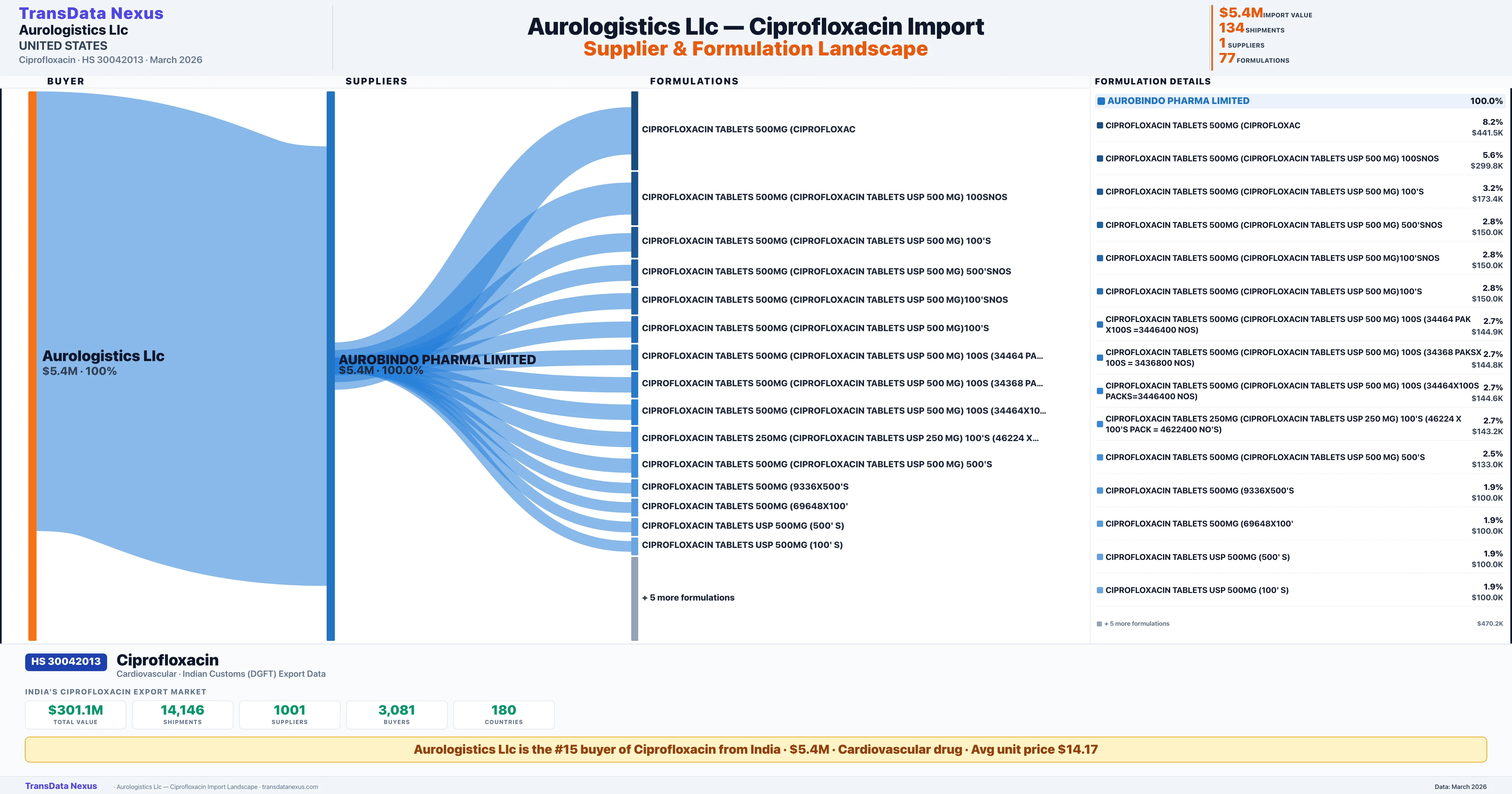 AUROLOGISTICS LLC sources Ciprofloxacin from 1 verified Indian supplier: AUROBINDO PHARMA LIMITED ($5.4M, 100.0%). This is based on 134 customs records.