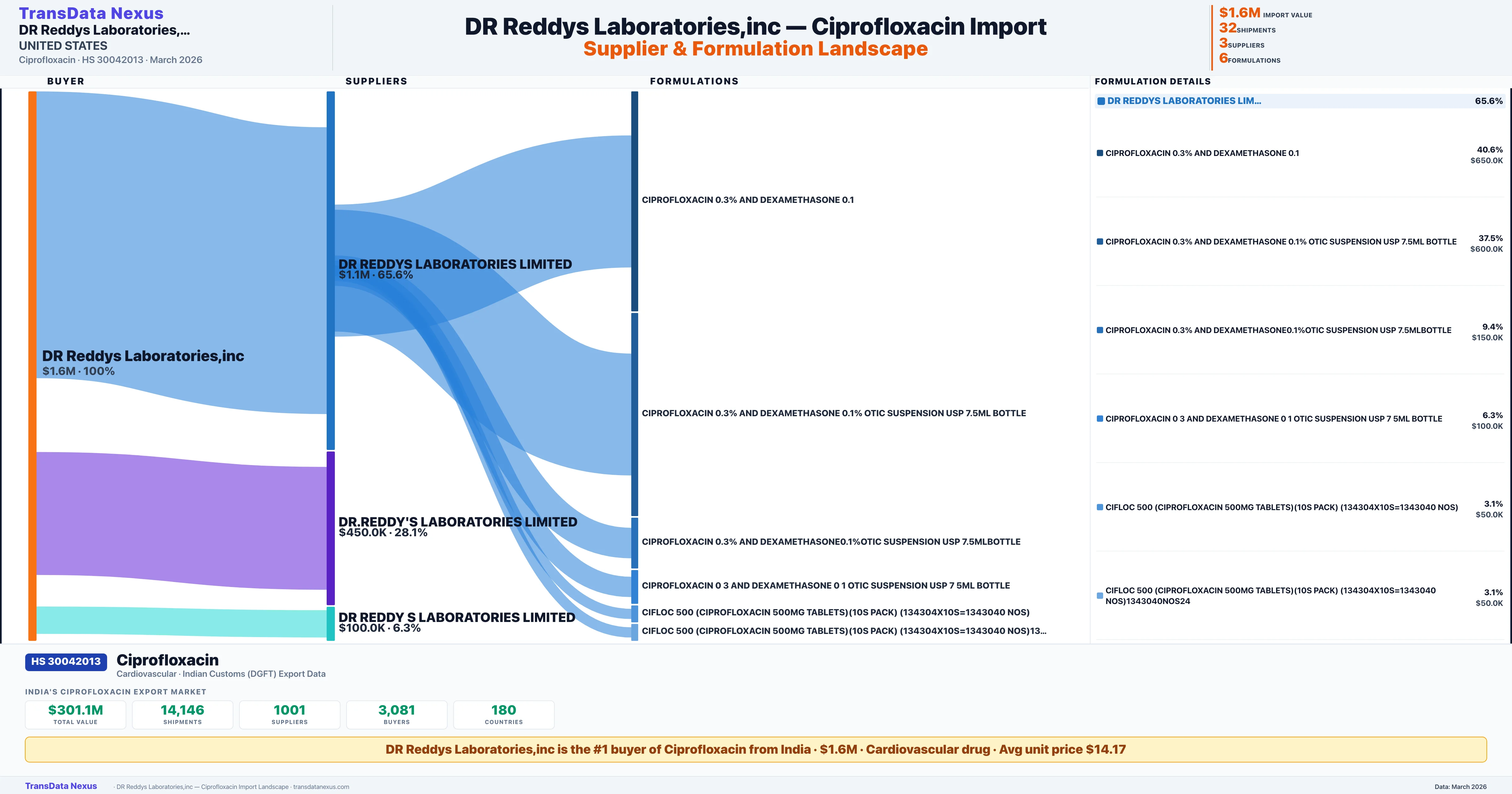 DR REDDYS LABORATORIES INC sources Ciprofloxacin from 3 verified Indian suppliers: DR REDDYS LABORATORIES LIMITED ($1.1M, 65.6%), DR.REDDY'S LABORATORIES LIMITED ($450.0K, 28.1%), DR REDDY S LABORATORIES LIMITED ($100.0K, 6.3%). This is based on 32 customs records.