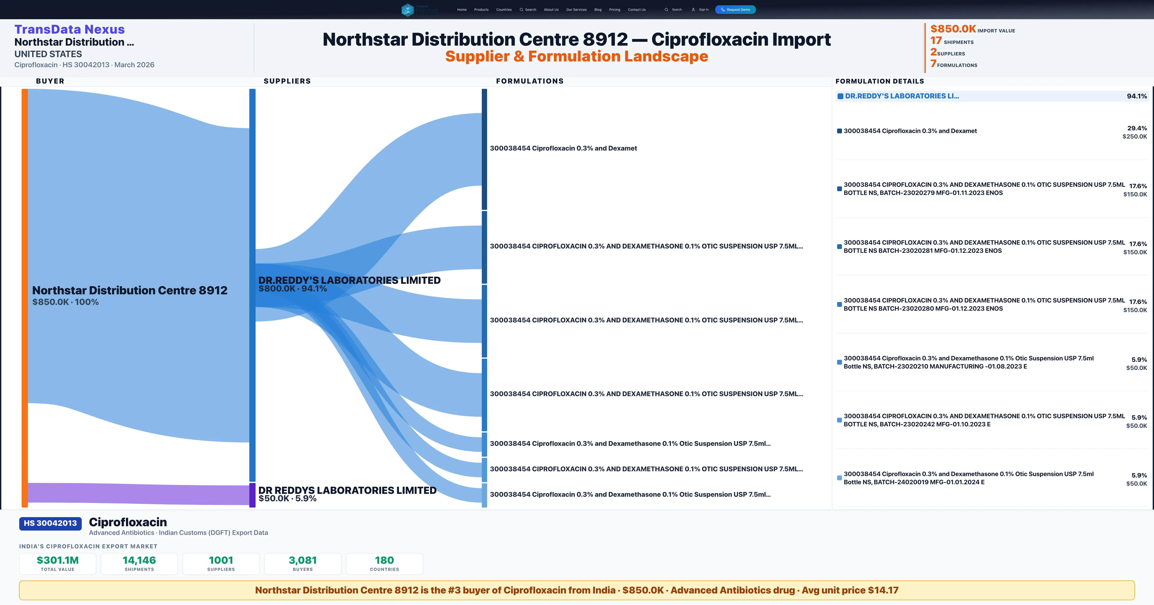 Access order-level details, pricing data, supplier connections, and competitive analysis for NORTHSTAR DISTRIBUTION CENTRE 8912's Ciprofloxacin imports. TransData Nexus provides verified Indian Customs (DGFT) data trusted by pharmaceutical trade professionals worldwide.