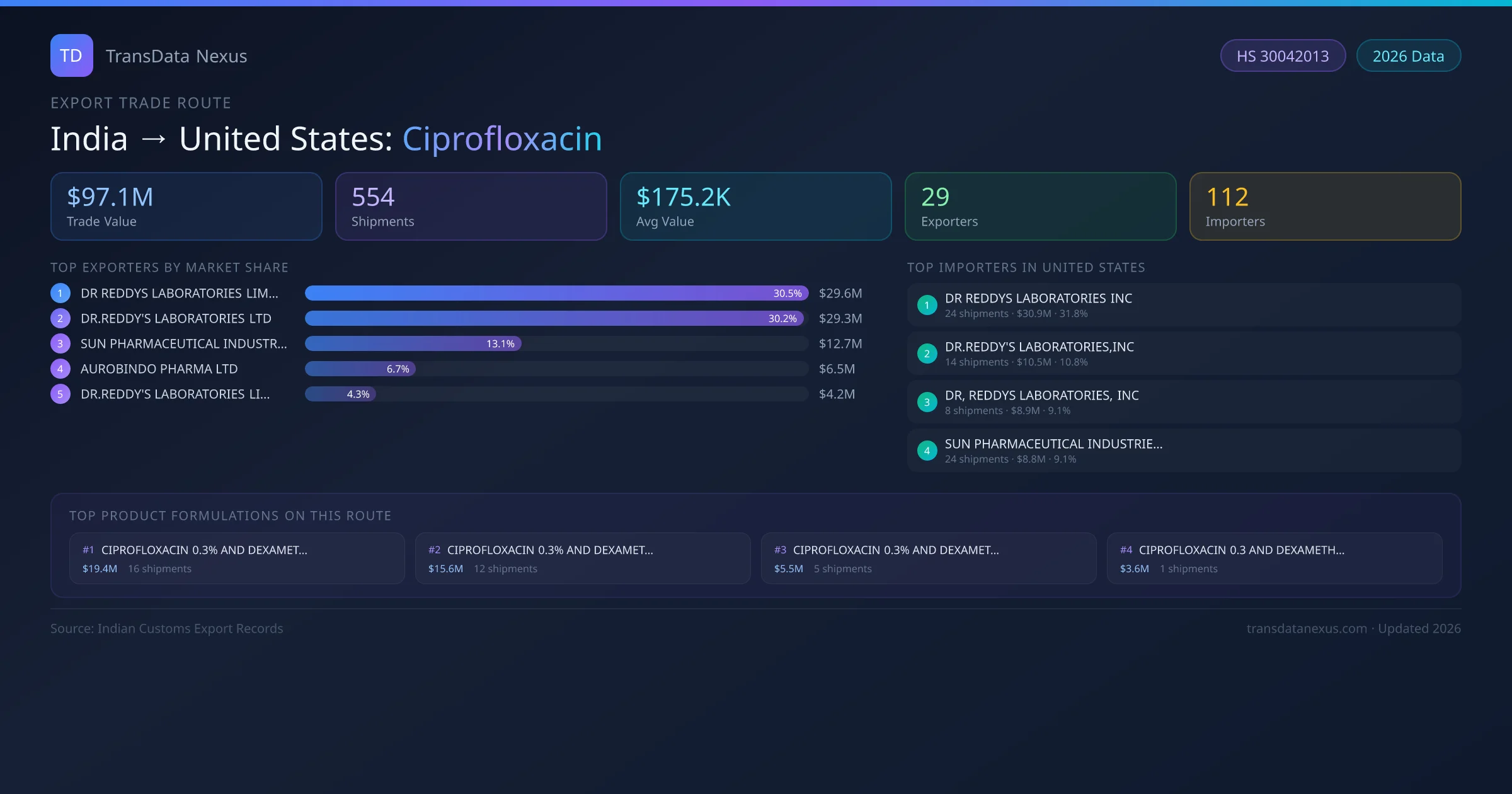 India has recorded 554 verified shipments of Ciprofloxacin exported to United States, representing a combined trade value of $97.1M USD. This corridor is served by 29 active Indian exporters, with an average shipment value of $175.2K USD. The leading Indian exporter is DR REDDYS LABORATORIES LIMITED, which accounts for 31% of total export value with 22 shipments worth $29.6M USD. On the buying side, DR REDDYS LABORATORIES INC is the largest importer in United States with $30.9M USD in purchases. The top 3 suppliers — DR REDDYS LABORATORIES LIMITED, DR.REDDY'S LABORATORIES LTD, SUN PHARMACEUTICAL INDUSTRIES LIMITED — together control 74% of total trade value on this route. All data sourced from Indian Customs (DGFT) shipping bill records. Values reported in FOB USD.
