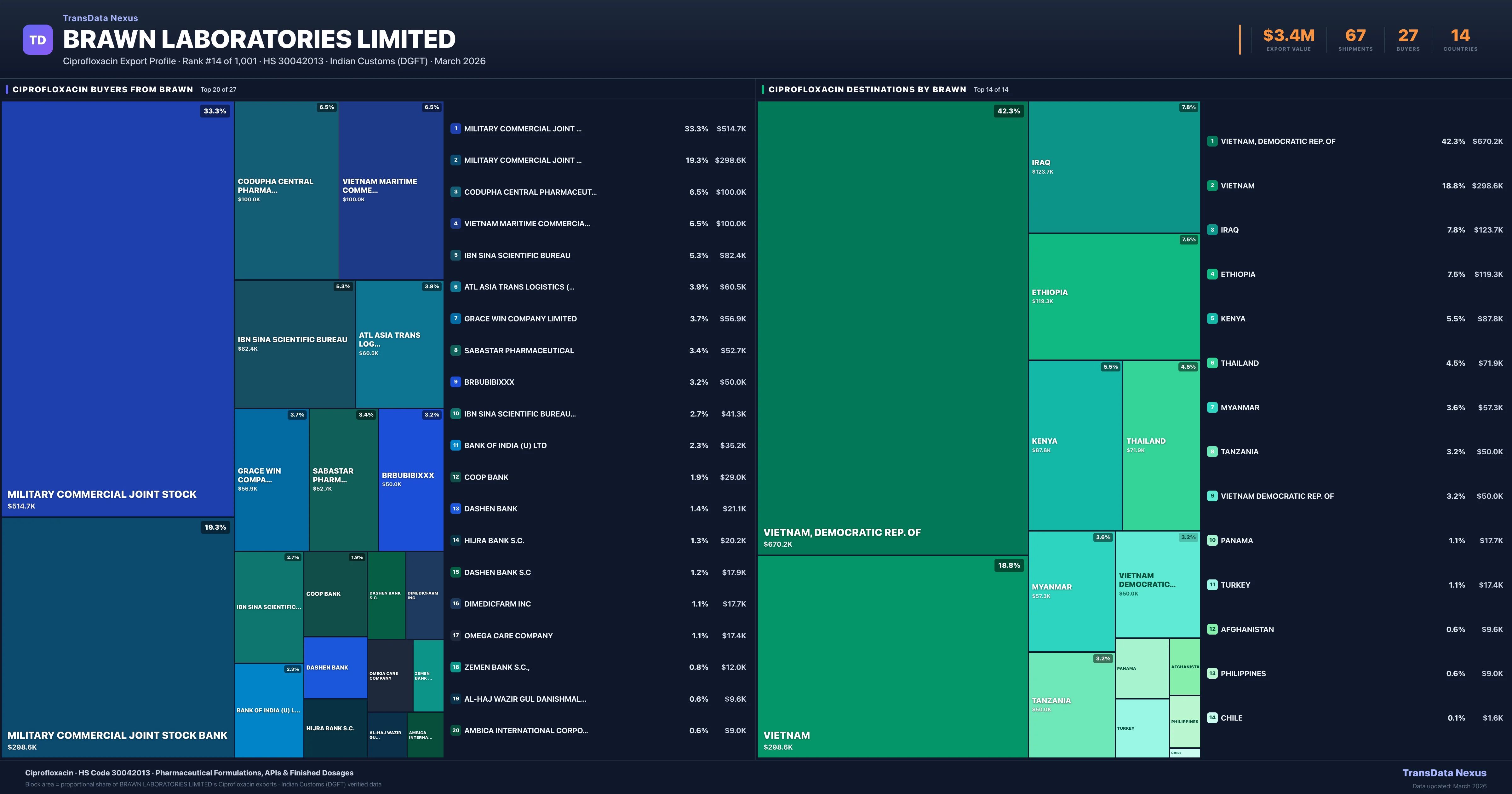 Brawn Laboratories Limited supplies Ciprofloxacin to 27 buyers globally. The largest buyer is MILITARY COMMERCIAL JOINT STOCK (VIETNAM, DEMOCRATIC REP. OF), followed by MILITARY COMMERCIAL JOINT STOCK BANK (VIETNAM) and CODUPHA CENTRAL PHARMACEUTICAL (VIETNAM, DEMOCRATIC REP. OF). These buyers represent pharmaceutical distributors, hospital groups, and government procurement agencies in their respective markets.