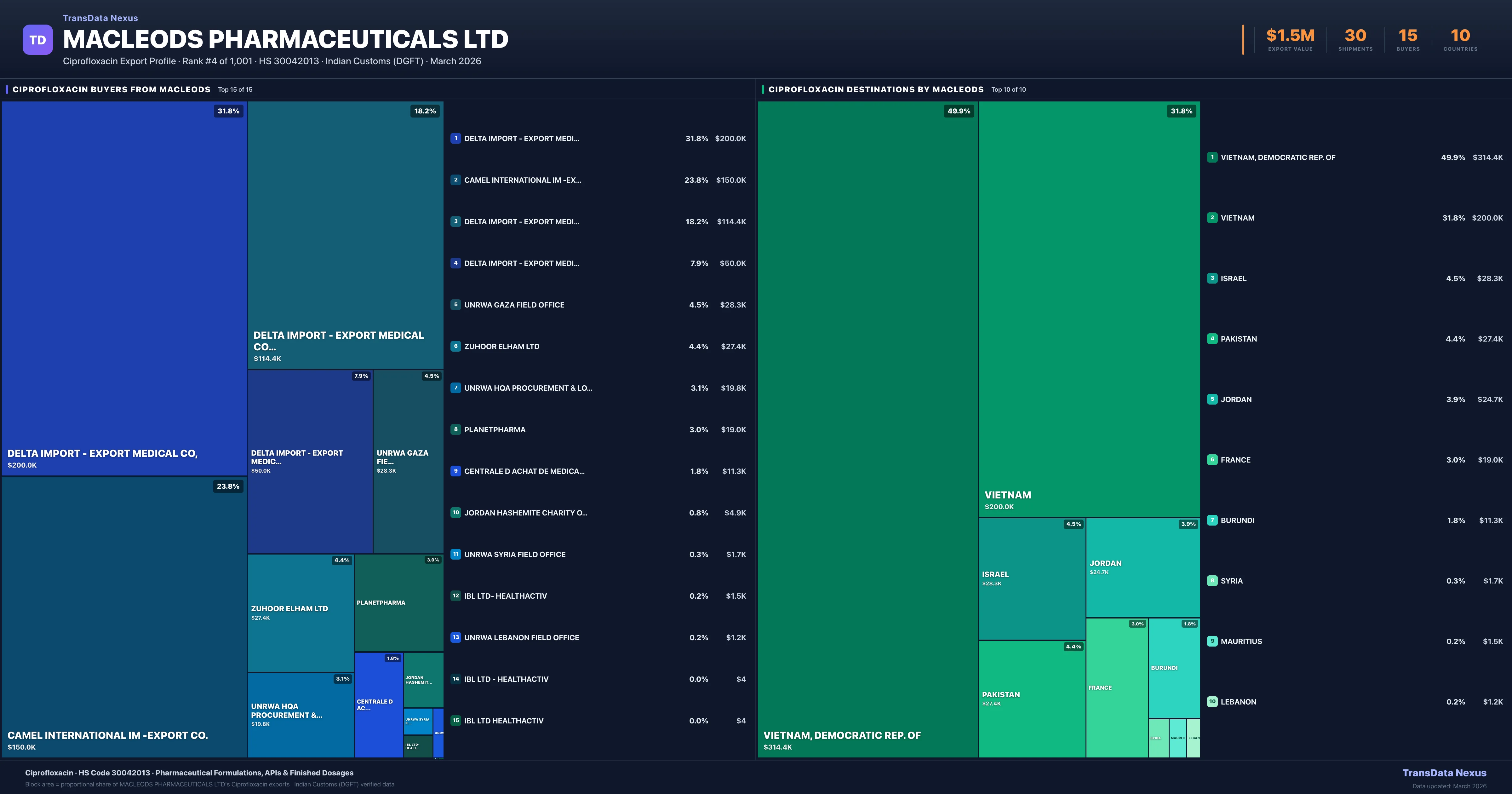 Macleods Pharmaceuticals Ltd supplies Ciprofloxacin to 15 buyers globally. The largest buyer is DELTA IMPORT - EXPORT MEDICAL CO, (VIETNAM, DEMOCRATIC REP. OF), followed by CAMEL INTERNATIONAL IM -EXPORT CO. (VIETNAM) and DELTA IMPORT - EXPORT MEDICAL CO., (VIETNAM, DEMOCRATIC REP. OF). These buyers represent pharmaceutical distributors, hospital groups, and government procurement agencies in their respective markets.