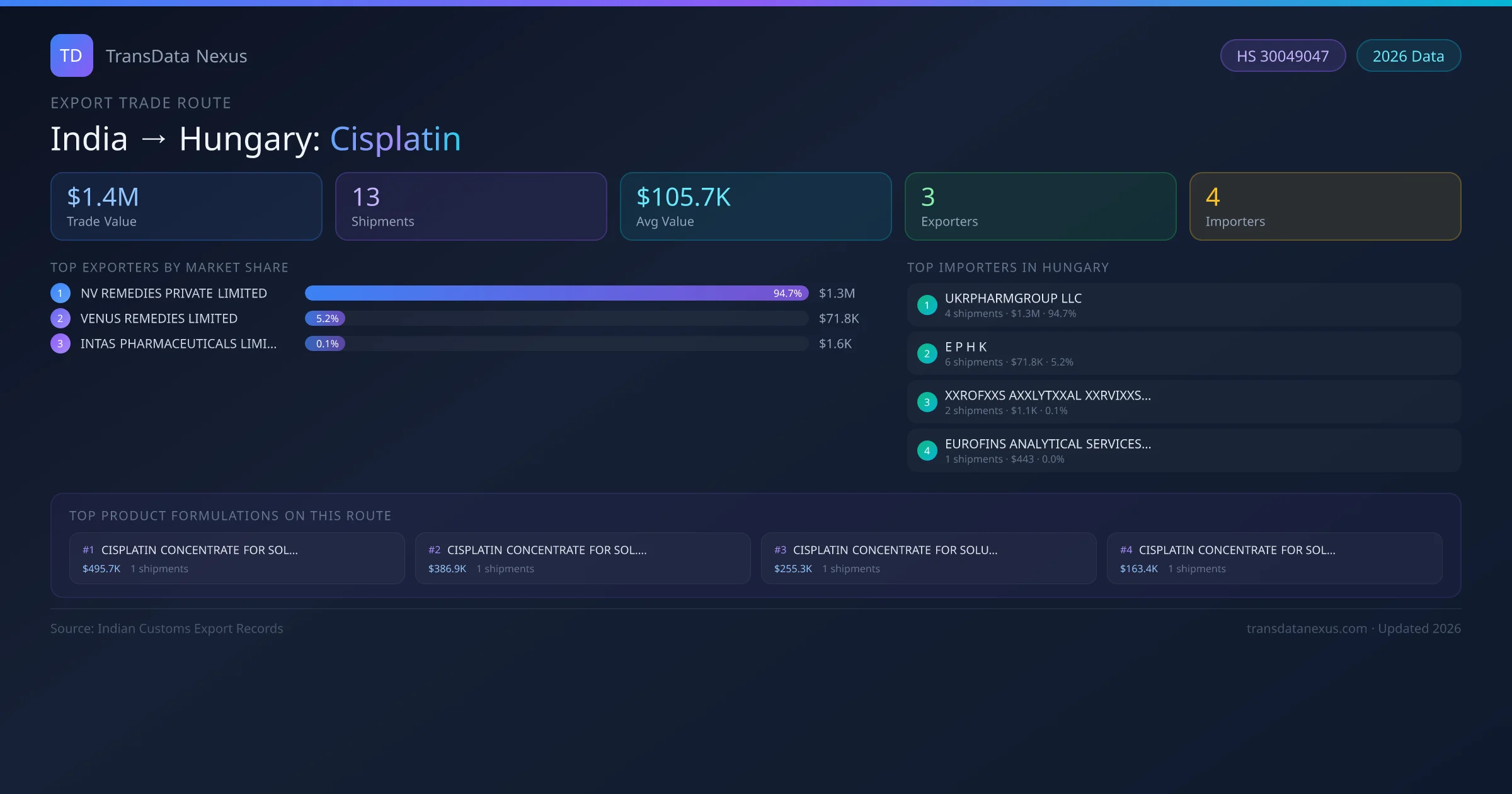 - 1.Route Identification: India to Hungary export trade corridor identified from Indian Customs (DGFT) records for Cisplatin.