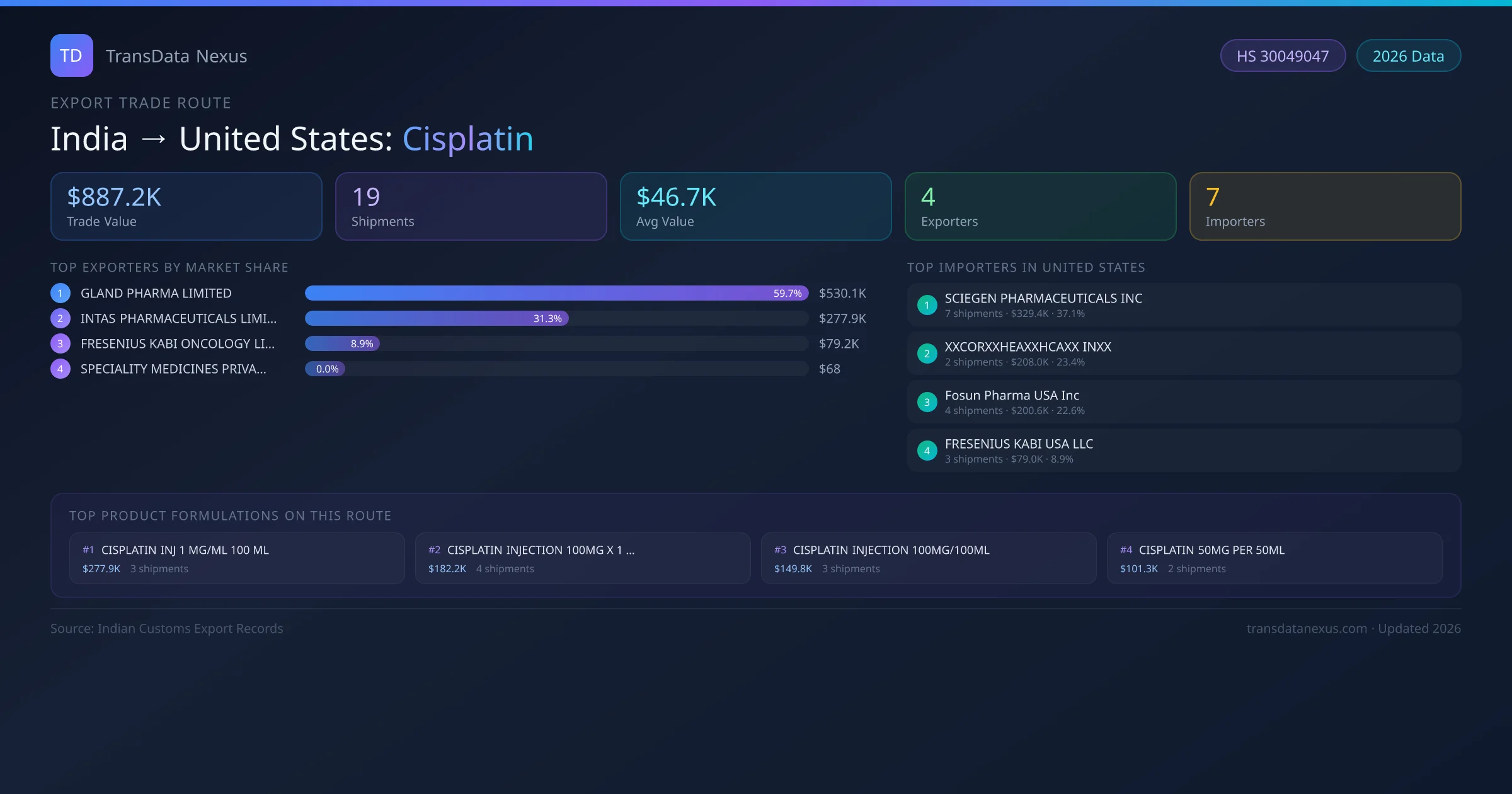 The India to United States Cisplatin corridor is one of India's established pharmaceutical export routes, with 19 shipments documented worth a combined $887.2K USD. The route is dominated by GLAND PHARMA LIMITED, which alone accounts for roughly 60% of all export value, reflecting the consolidated nature of India's cisplatin manufacturing sector.