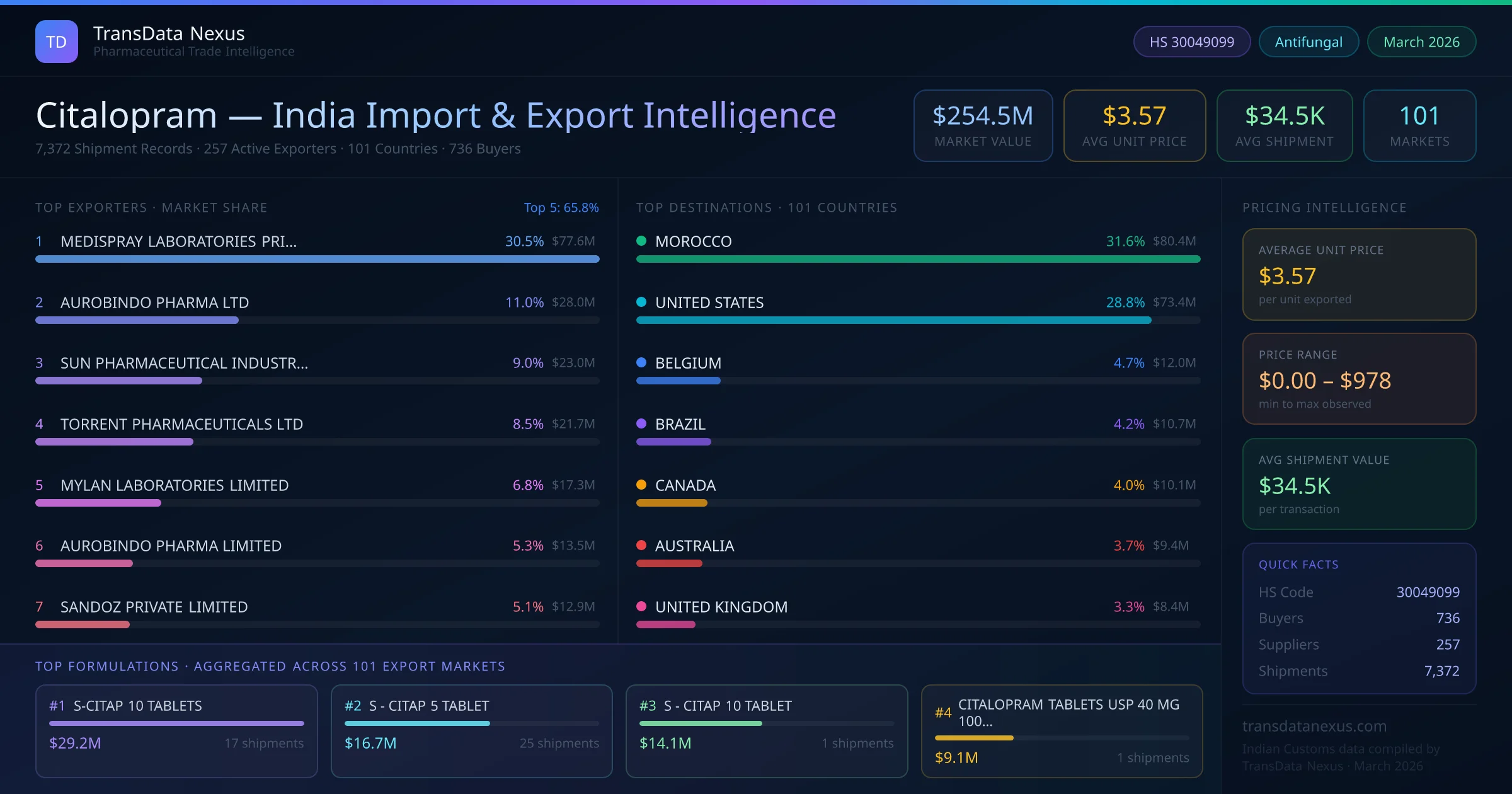 Between 2022 and 2026, India exported $254.5M worth of citalopram across 7,372 verified shipments to 101 countries — covering 52% of world markets in the CNS & Psychiatric segment. The largest destination is MOROCCO (31.6%). MEDISPRAY LABORATORIES PRIVATE LIMITED leads with a 30.5% share. All figures are drawn from Indian Customs (DGFT) shipping bill records spanning four years of trade activity.