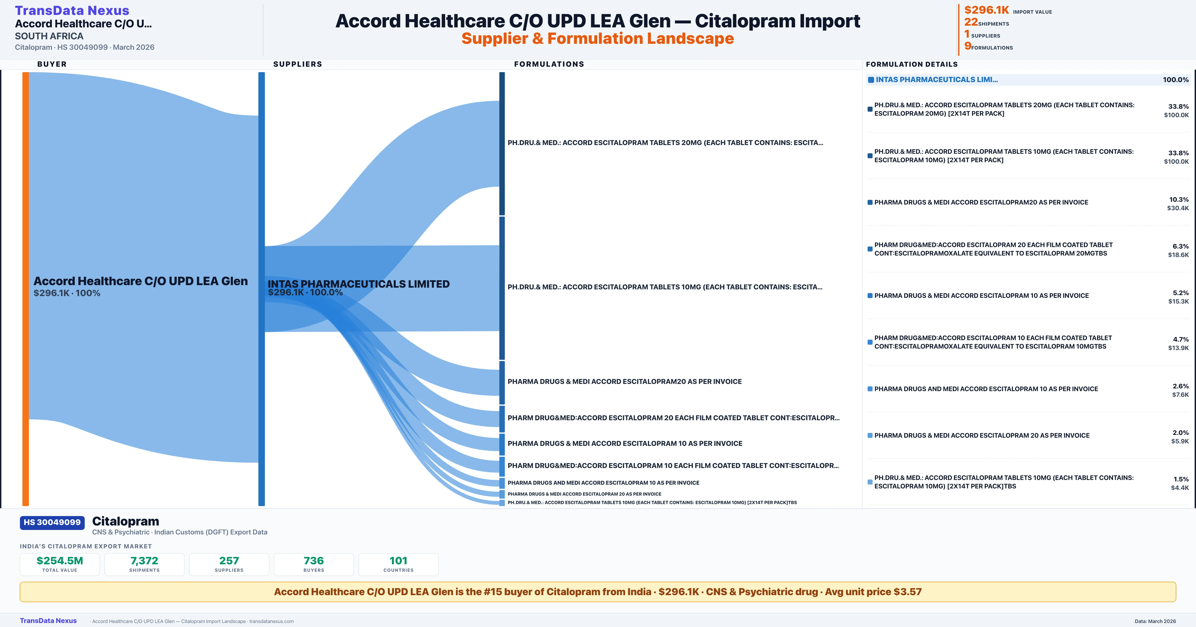 ACCORD HEALTHCARE C/O UPD LEA GLEN sources Citalopram from 1 verified Indian supplier: INTAS PHARMACEUTICALS LIMITED ($296.1K, 100.0%). This is based on 22 customs records.